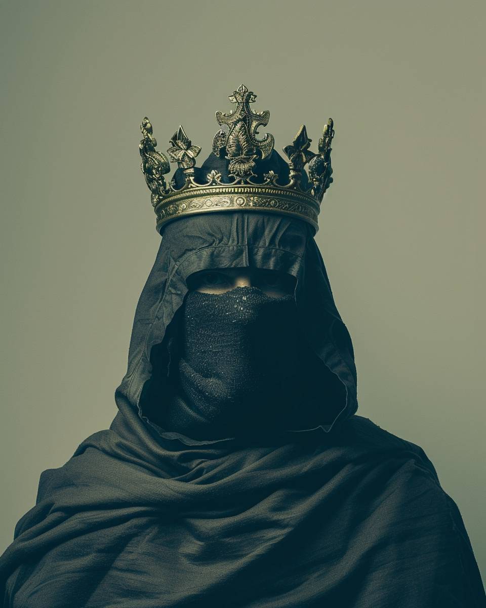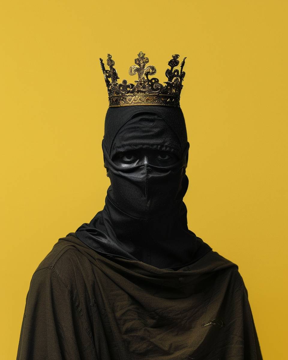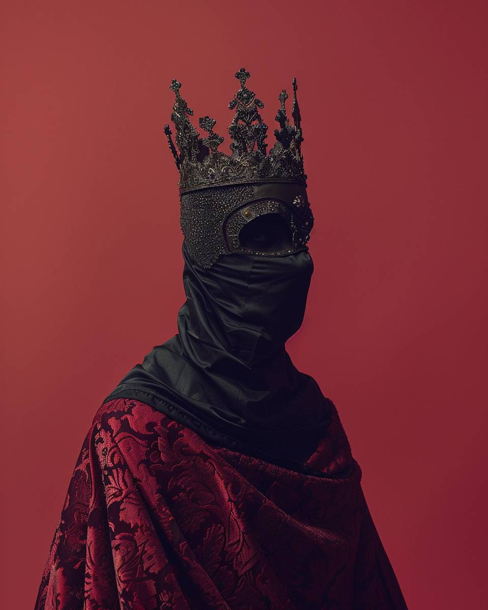 Portrait of a medieval king wearing a crown and balaclava on a solid color background, minimalist style award-winning photography in the style of Tim Walker.