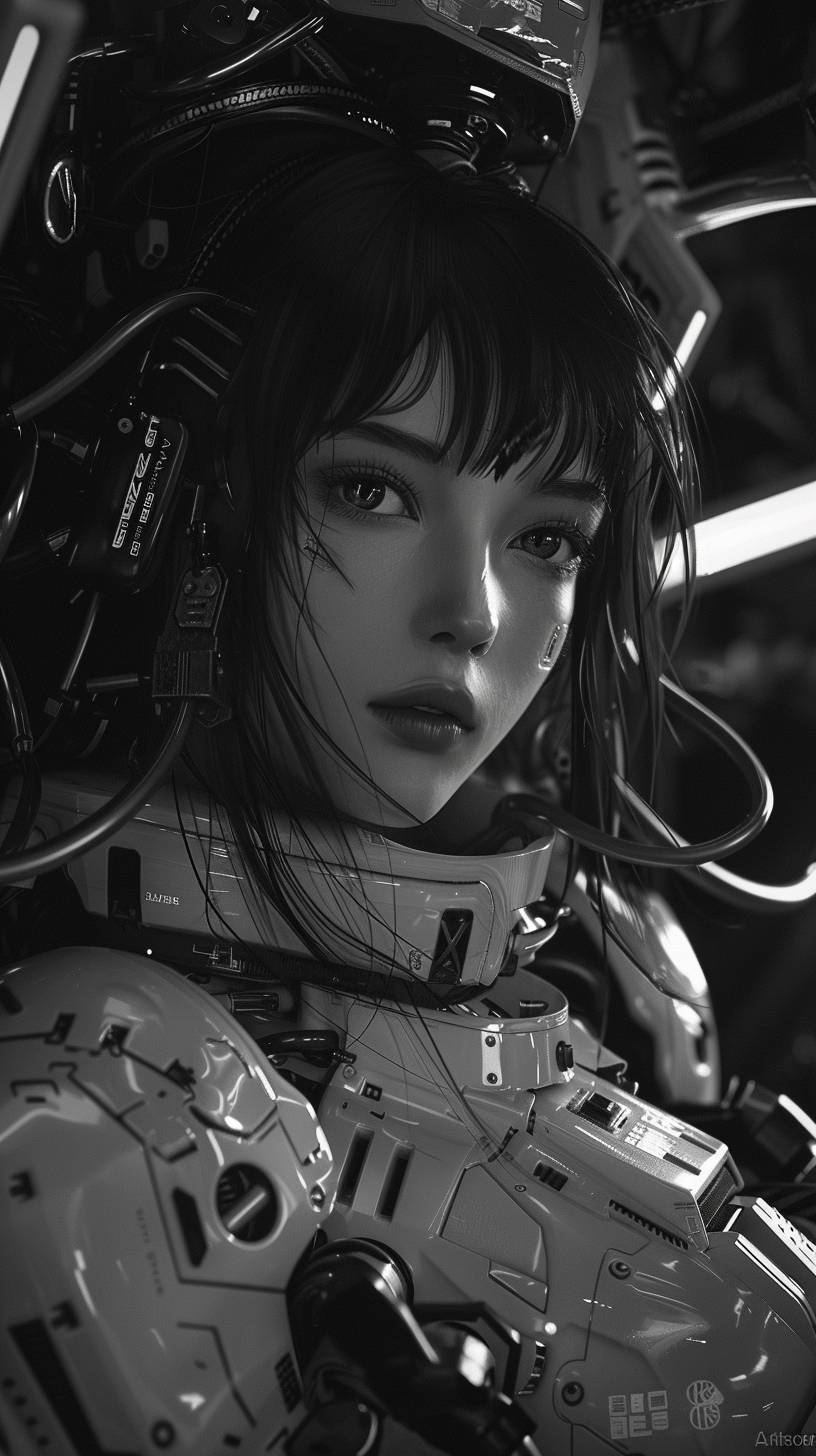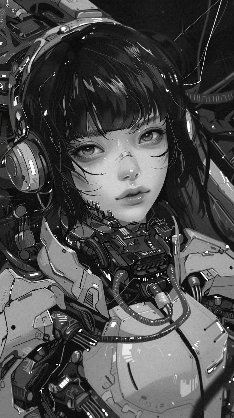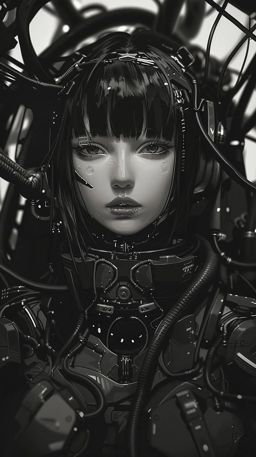 black and white illustration of an anime girl in a mech suit, in the cyberpunk style, with dark hair and bangs, looking at the camera, wires everywhere, black background, full body portrait, detailed face, concept art, artstation --ar 9:16 --v 6.0