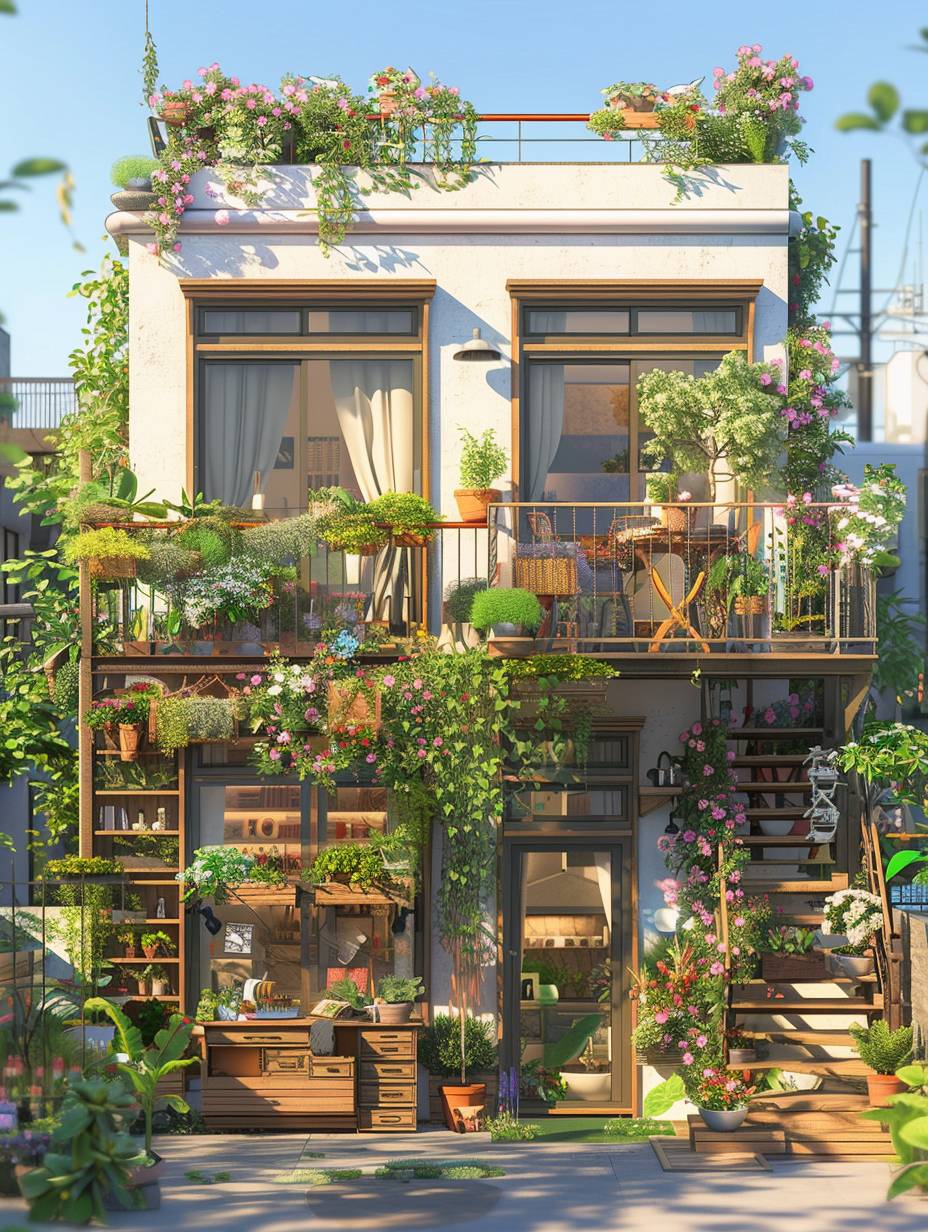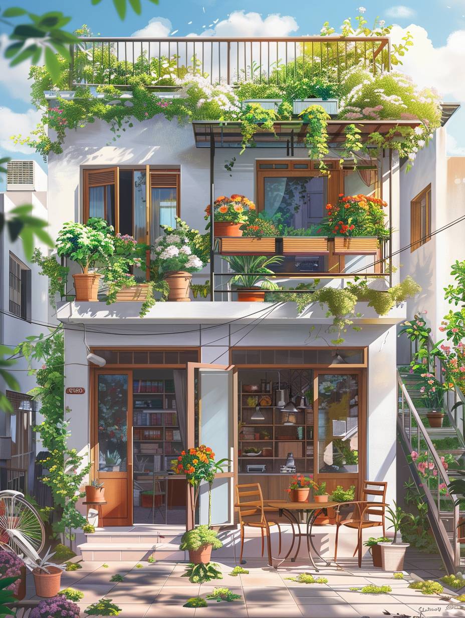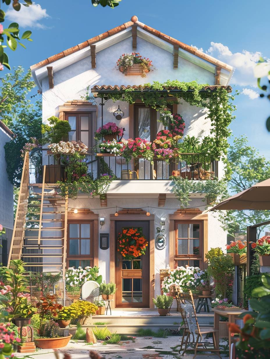 Different kinds of flowers,a cute houses with a balcony and terrace on the first floor,second story windows,a small garden in front of the entrance to the building, a home office,a living room with a large window overlooking the street,a kitchen with potted plants on a table,a dining area with wooden chairs,a staircase leading up to the third level,white walls,beautiful sky, exquisite architectural details. Ultra-clear details, bright colors, masterful composition, wide-angle lens, 8K high-definition image. --ar 3:4 --v 6.0