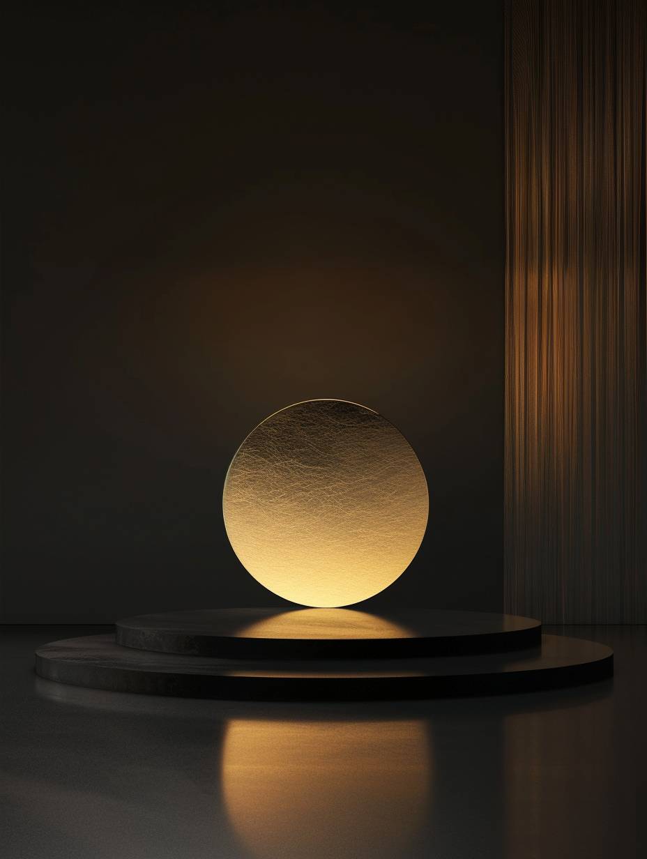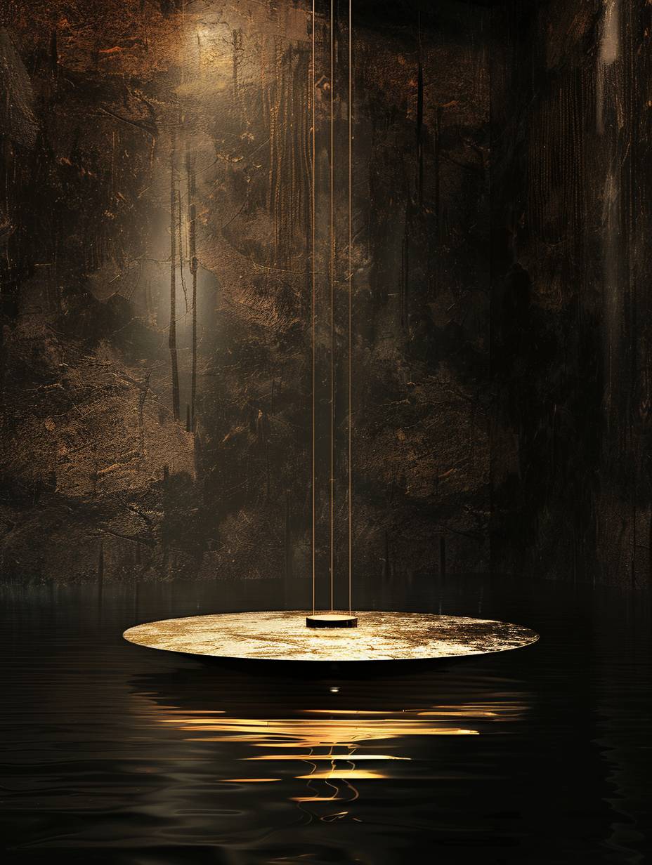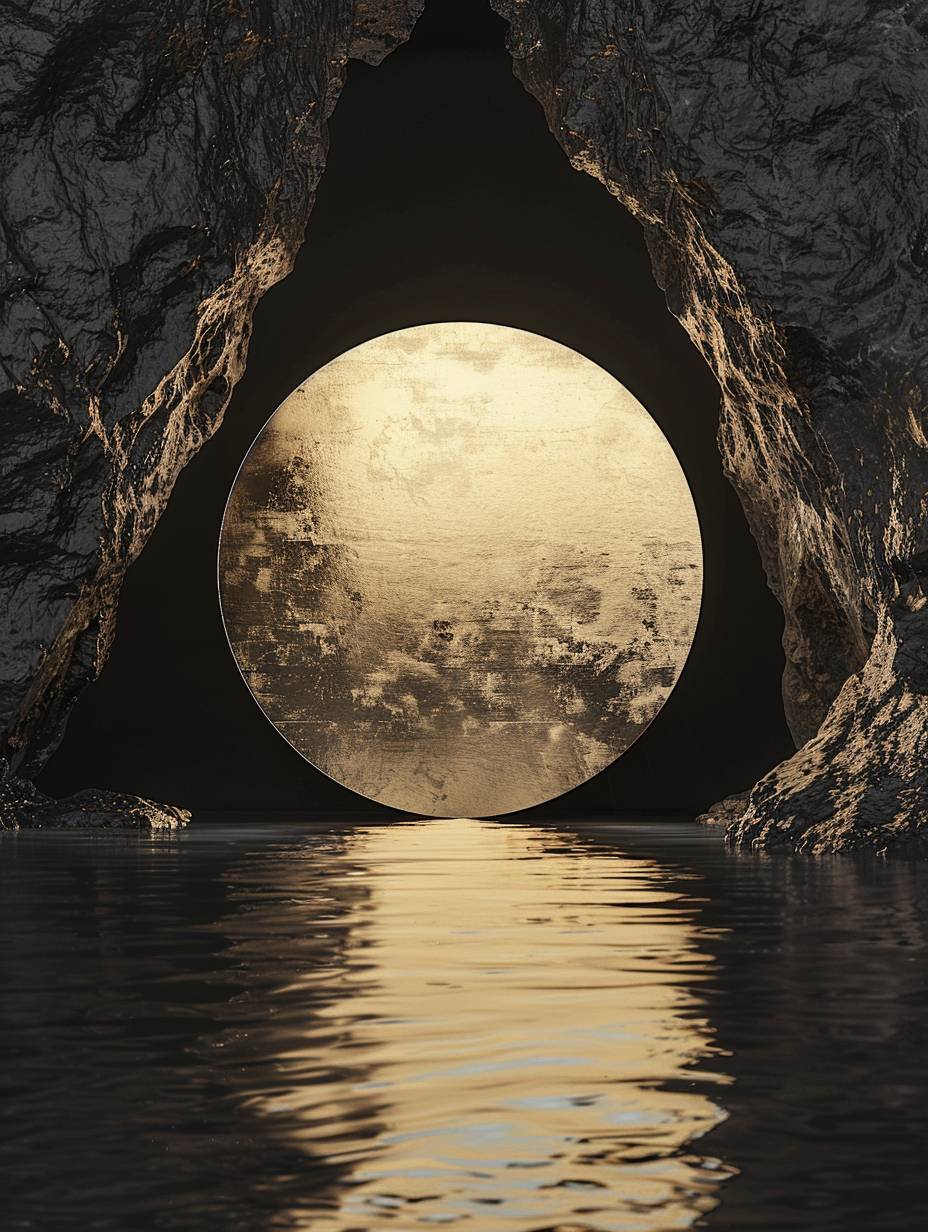 in the style of minimalist stage designs,In the distance The golden disc serves as a screen,mirrored lakes, Minimalist,Black and golden brown,depth, Studio Lighting, High Quality, Super Detailed, Ultra HD 32K UHD --ar 3:4 --v 6.0