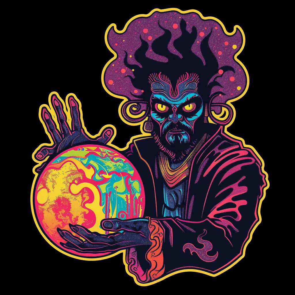 evil djinn holds a plasma globe cult iconography icon diecut sticker peter max over a black background. flat colors. defined outlines --ar 1:1 --v 6.0
