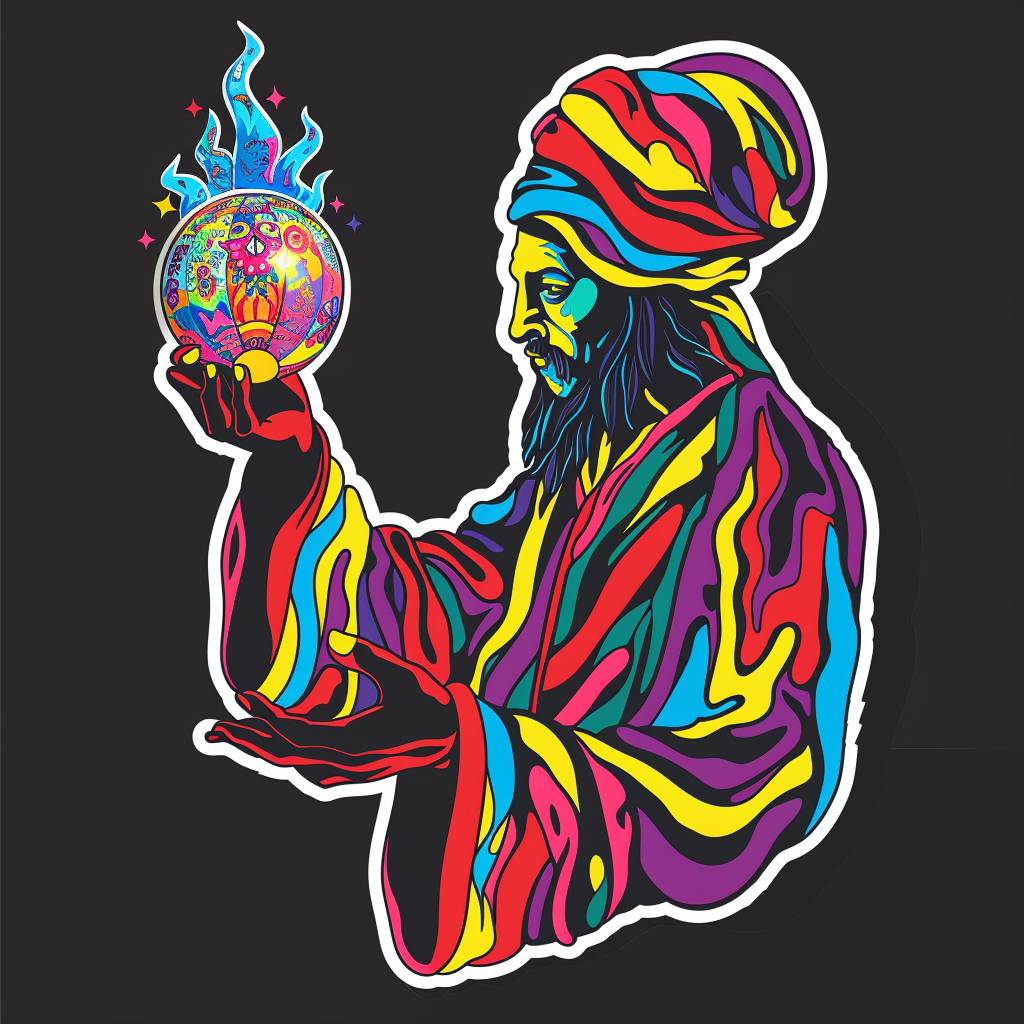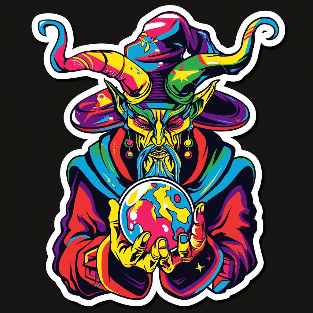 An evil djinn holds a plasma globe, featuring cult iconography as a die-cut sticker designed by Peter Max over a black background. Flat colors and defined outlines.