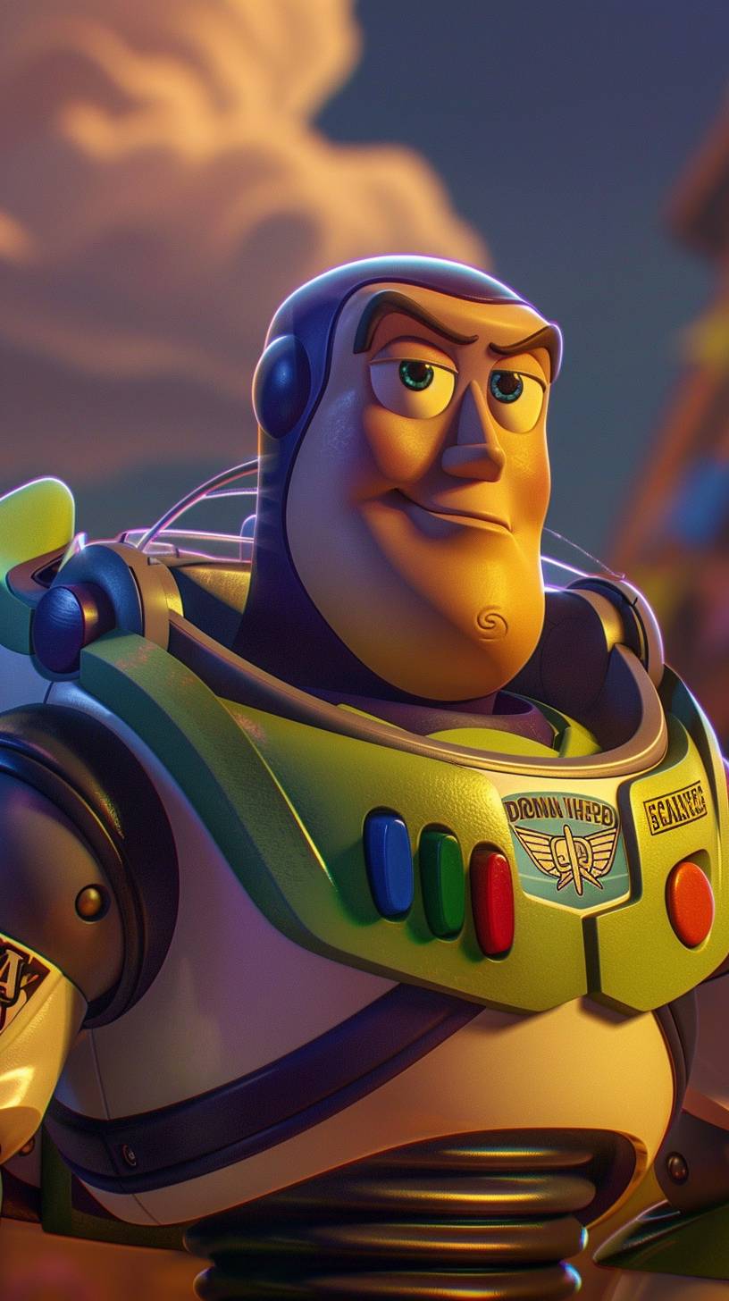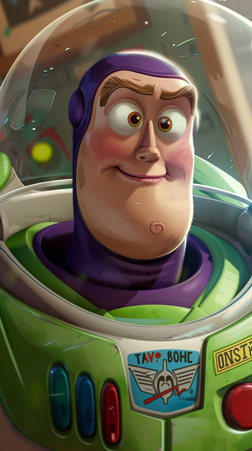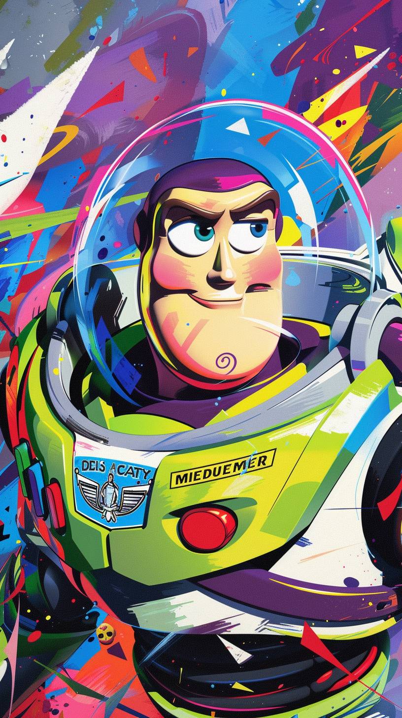 Buzz Lightyear, In the style of Toy Story, Close up, full body,Mixed patterns, Text and emoji installations, Mood, Emotional illustrations, With special emphasis on super exaggerated big ears,Funny expression,in the style of large brushstrokes/loose brushwork, disney animation, playful use of texture, illustration, comic art, colorful animations --ar 9:16 --v 6.0