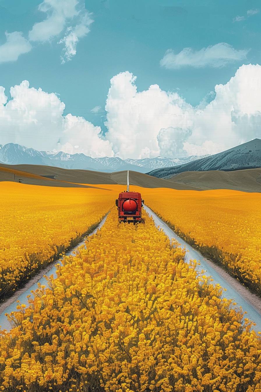 Minimalist magazine cover. traditional anatolian pattern tiled illustration in the style of the new yorker magazine.In a field of rapeseed flowers, there is a road on which a shiny tanker truck is driving. A viewed from above. Zhang Xiaogang, --ar 2:3 --v 6.0