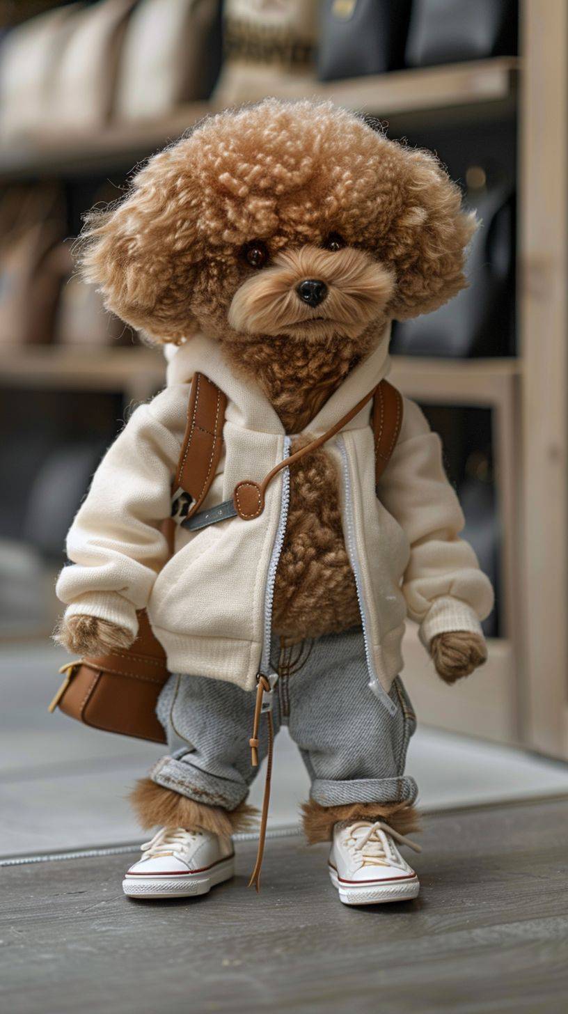Imagine a charming world where adorable animals take on a stylish human persona. Meet 'Paws in Pants', a lovable poodle with a fluffy coat the color of warm caramel, donning a cozy cream hoodie and snug denim jeans. This chic pup stands on its hind legs, sporting sleek sneakers that match the outfit perfectly. The ensemble is completed with a miniature leather backpack, resting on one shoulder. 'Paws in Pants' gazes at you with big, soulful eyes, full of curiosity and kindness, capturing hearts with its innocent charm. This cutely clad canine strolls through a pet-sized boutique, where fashion and furry friends blend seamlessly, creating a scene that's simply irresistible.