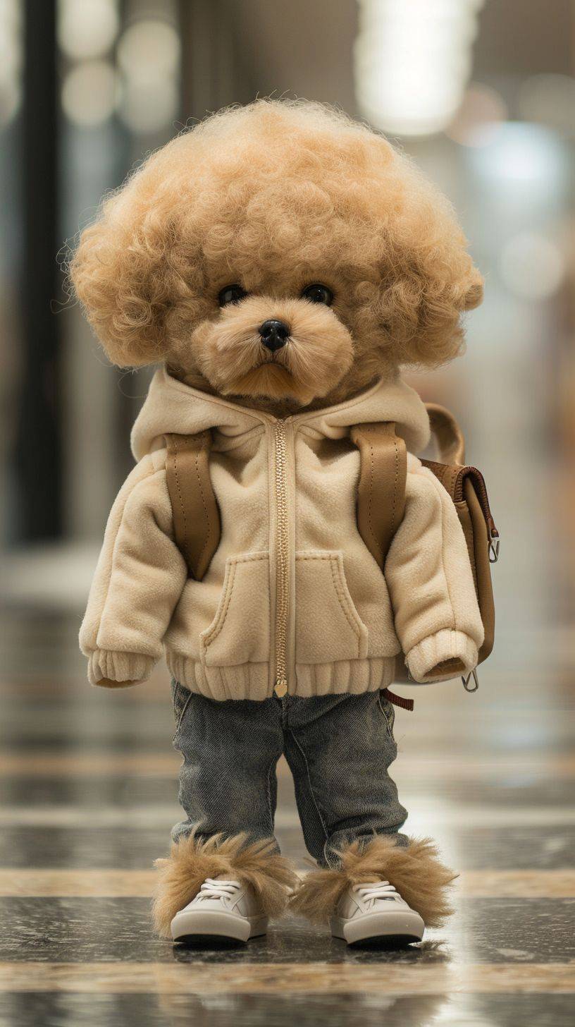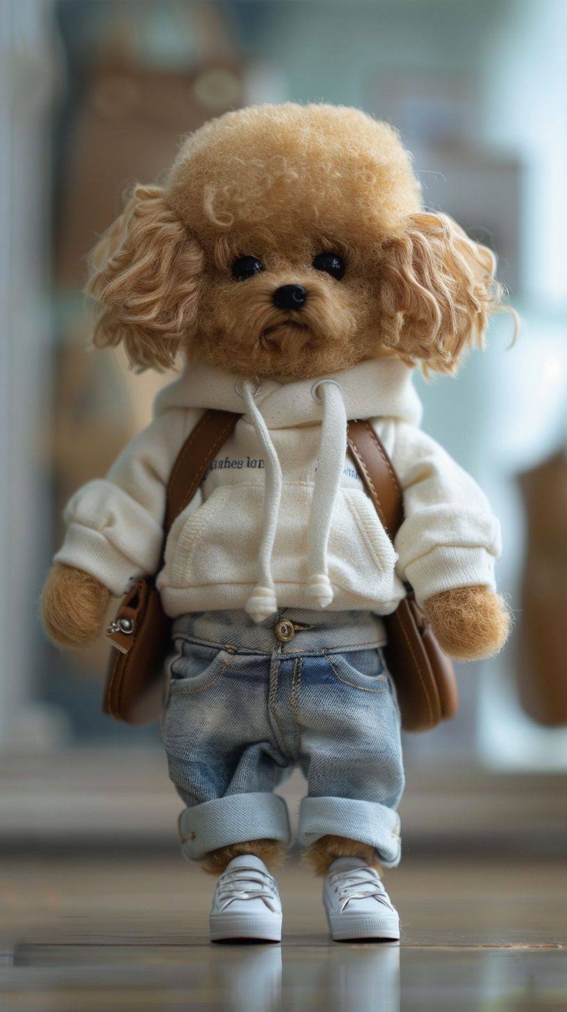 Imagine a charming world where adorable animals take on a stylish human persona. Meet 'Paws in Pants', a lovable poodle with a fluffy coat the color of warm caramel, donning a cozy cream hoodie and snug denim jeans. This chic pup stands on its hind legs, sporting sleek sneakers that match the outfit perfectly. The ensemble is completed with a miniature leather backpack, resting on one shoulder. 'Paws in Pants' gazes at you with big, soulful eyes, full of curiosity and kindness, capturing hearts with its innocent charm. This cutely clad canine strolls through a pet-sized boutique, where fashion and furry friends blend seamlessly, creating a scene that's simply irresistible. realistic --ar 9:16