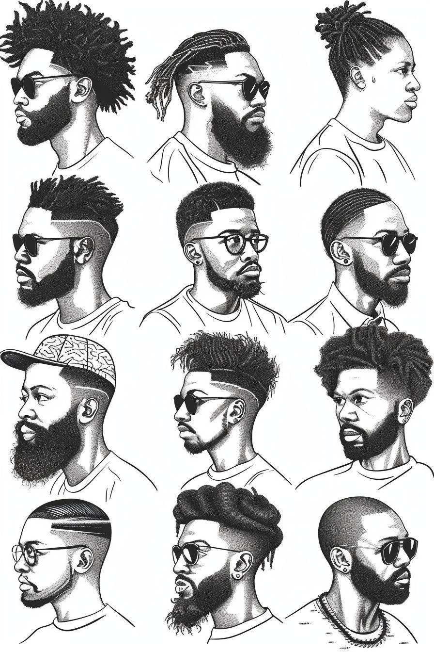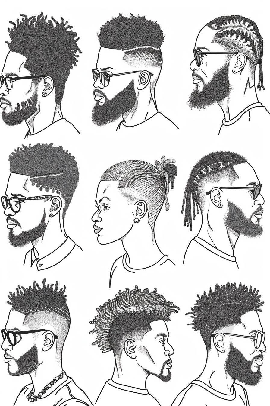 a simple coloring book page with a vector set of black men with different hairstyles on white background, outline only, thick outline --ar 2:3 --stylize 250