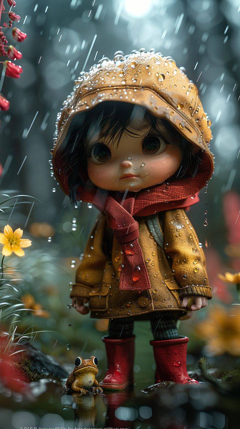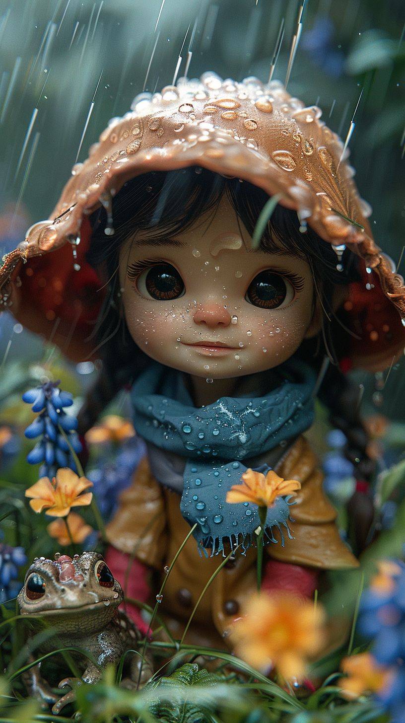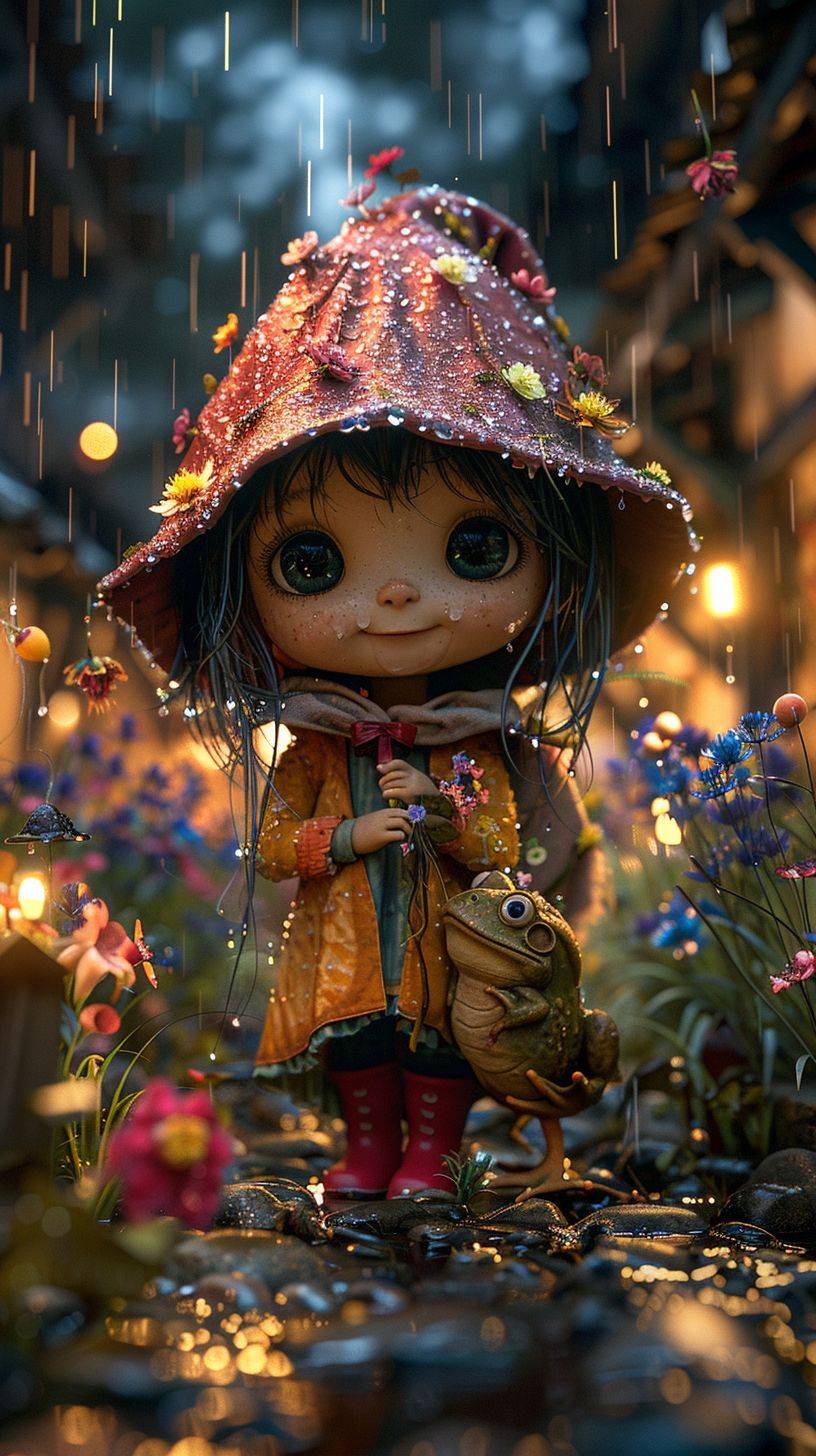 whimsical adorable character design 3d octane render, wide shot, chibi extremely cute little flower fairy hides behind flower in the rain, scared of toad, beautiful scenery, wisteria flowers, spring time, red rain boots, big eyes, award winning, hypermaximalist, octane render, cinematic lighting, detailed --ar 9:16 --stylize 1000