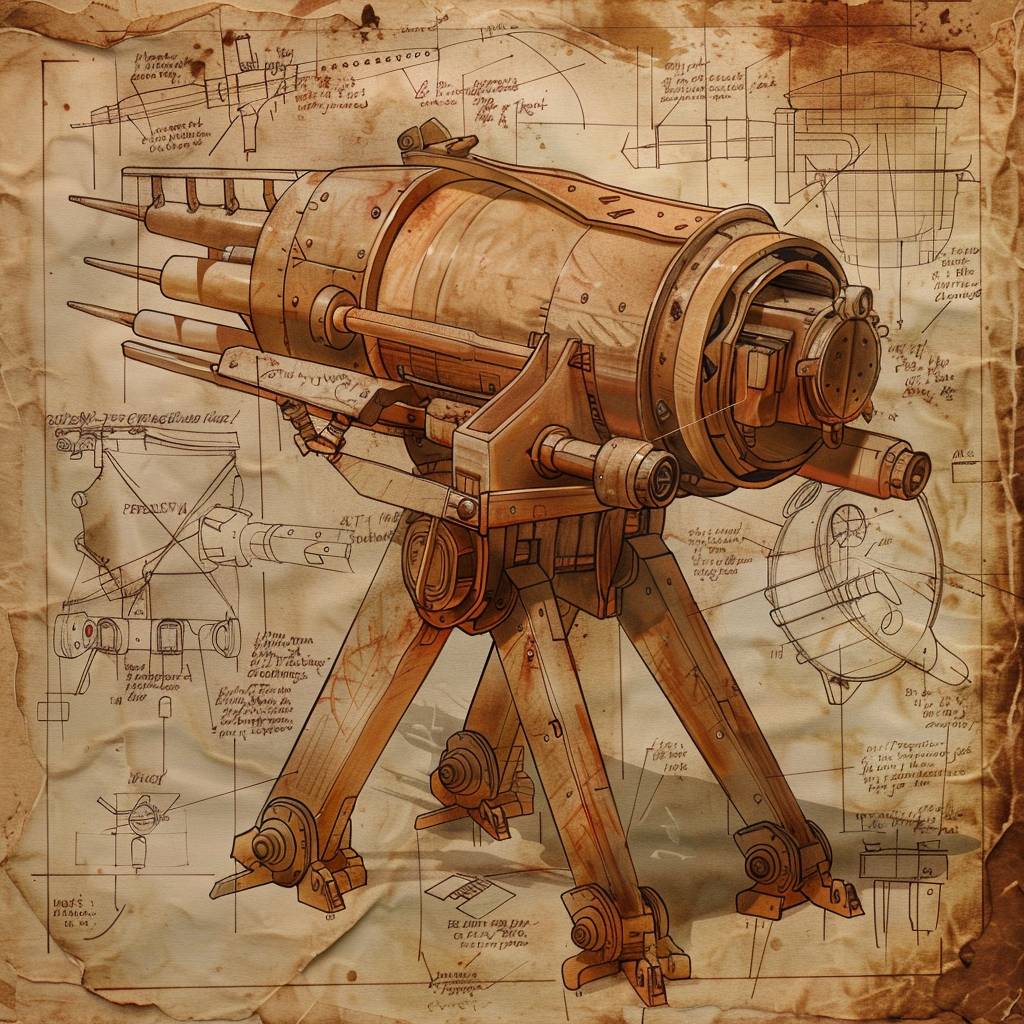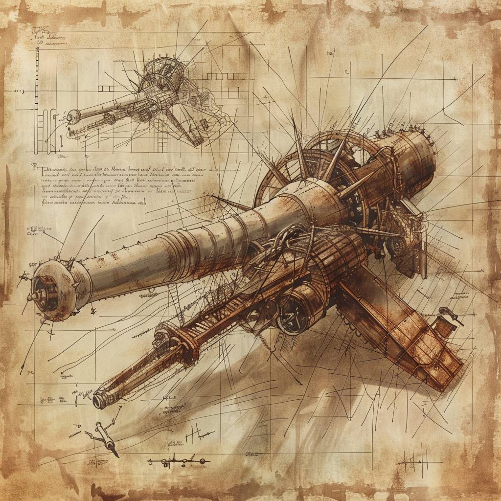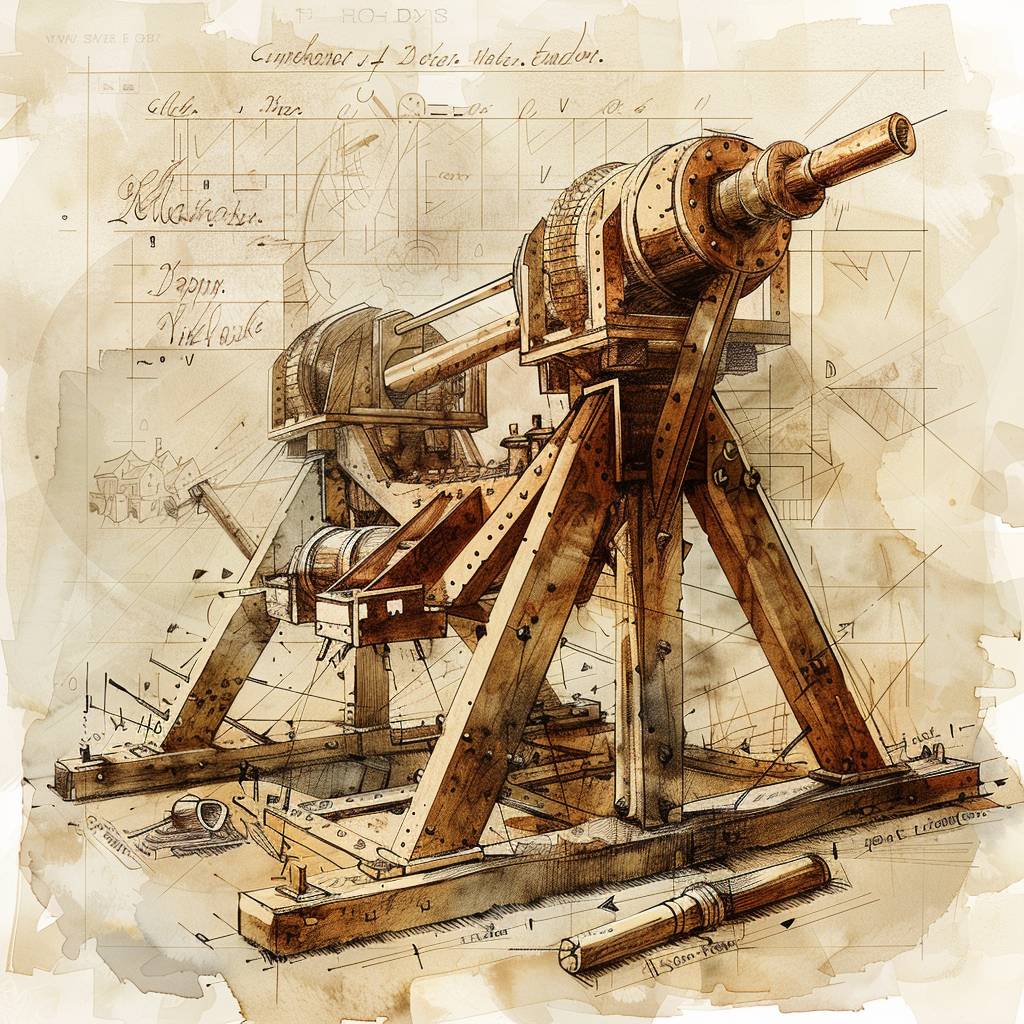 A Leonardo Da Vinci's sketch of a war machine. The sketch is colored and comes to life and moves.