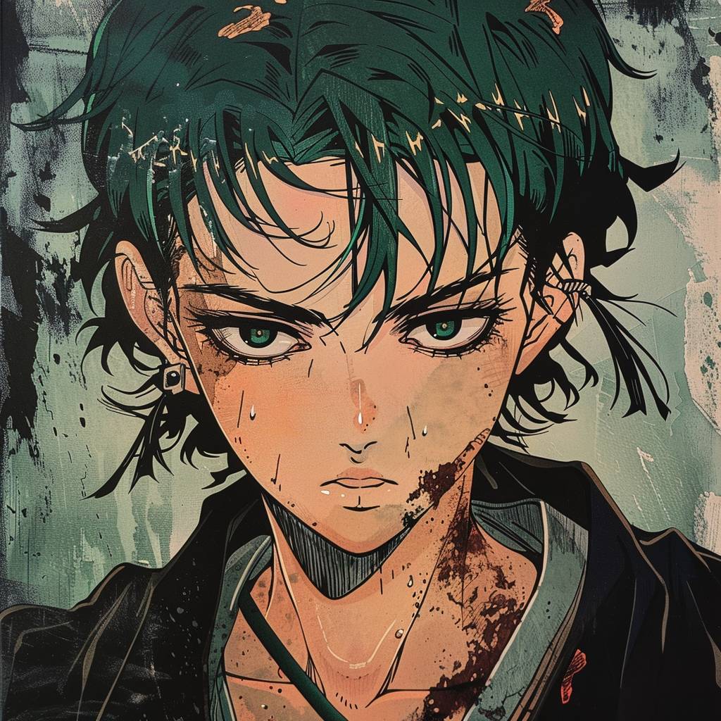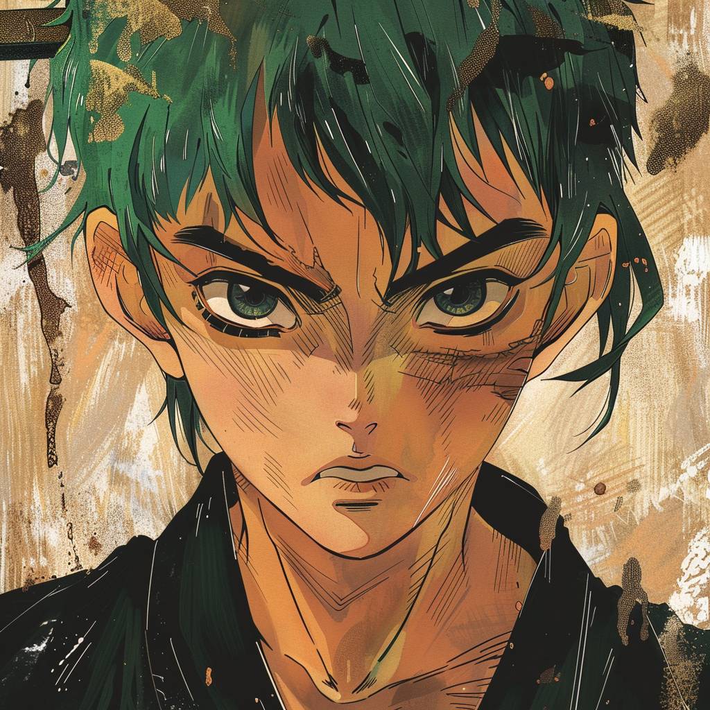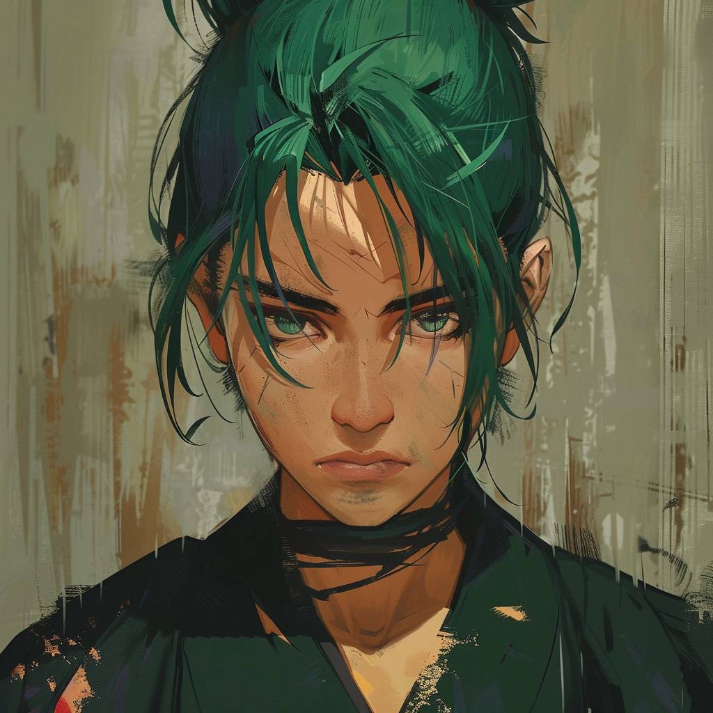 Young samurai with green hair and ripped black clothes, looking at the camera in anime style