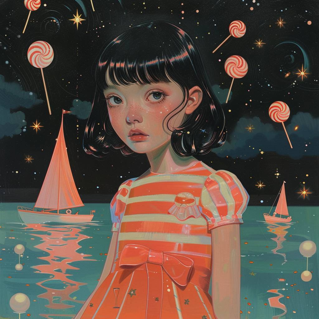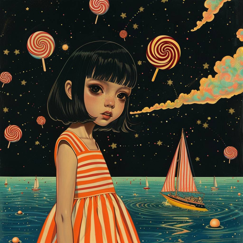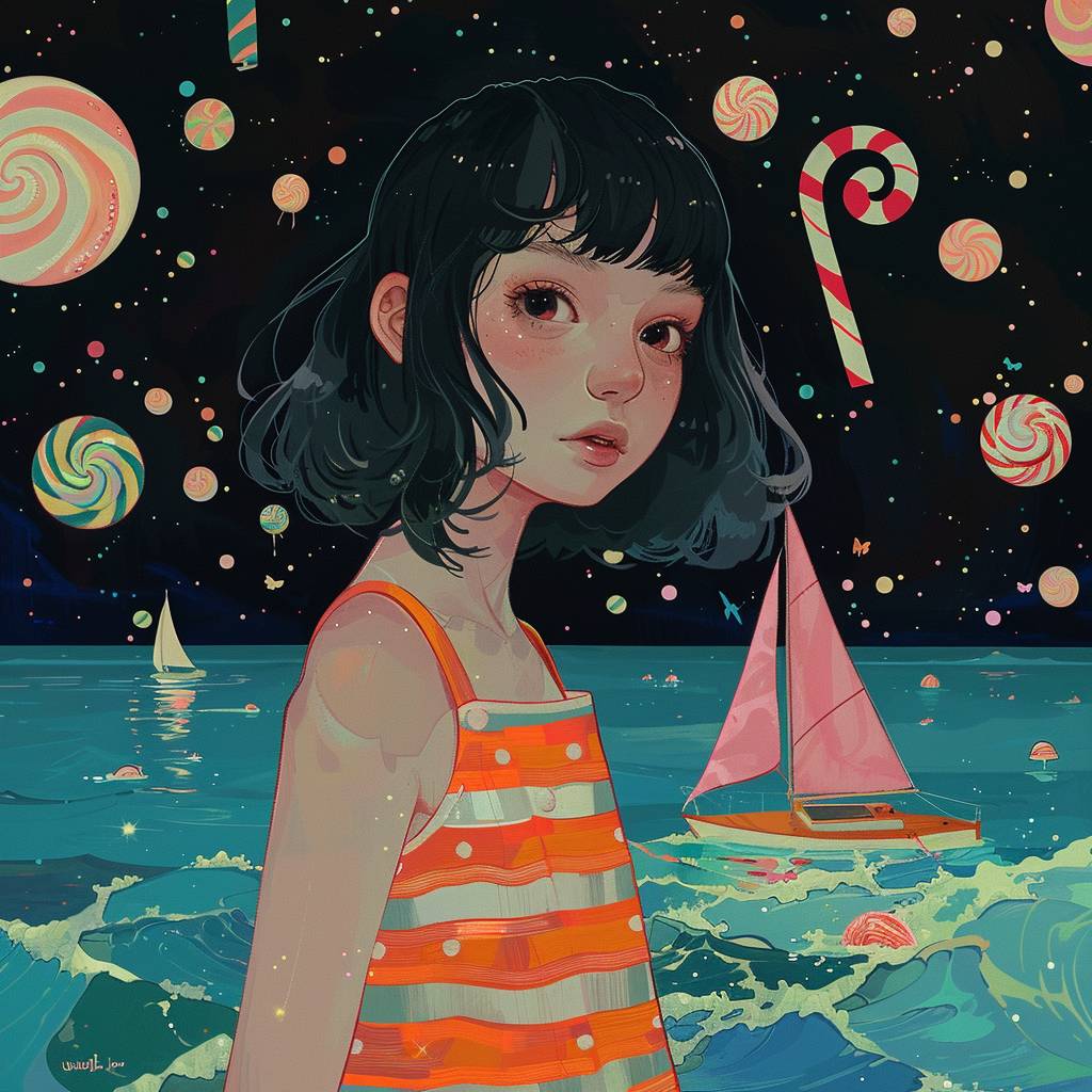 A young girl with black hair and bangs, wearing an orange striped dress adorned with pink candy cane stripes, stands on the sea at night. In front of her is a sailboat, while in the sky above there are stars and lollipops floating around. The illustration style is influenced by artists like James Jean and Ray Caesar, blending surrealism with dreamlike elements. It captures a whimsical atmosphere that combines fantasy and reality, creating a unique visual experience.