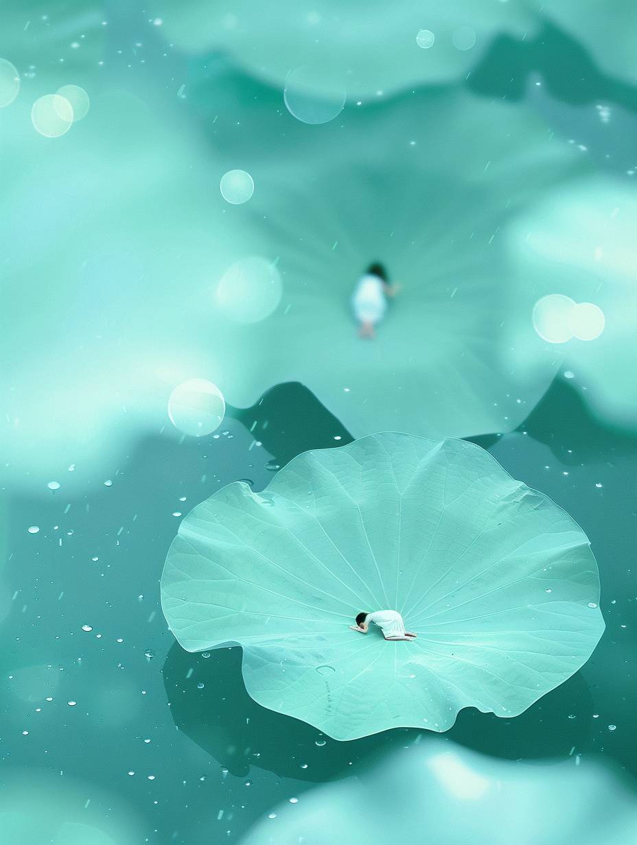 Lilliput illustration, China, tiny girl lying on a lotus leaf, microscopic, translucent, soft red, full of water drops, HD.