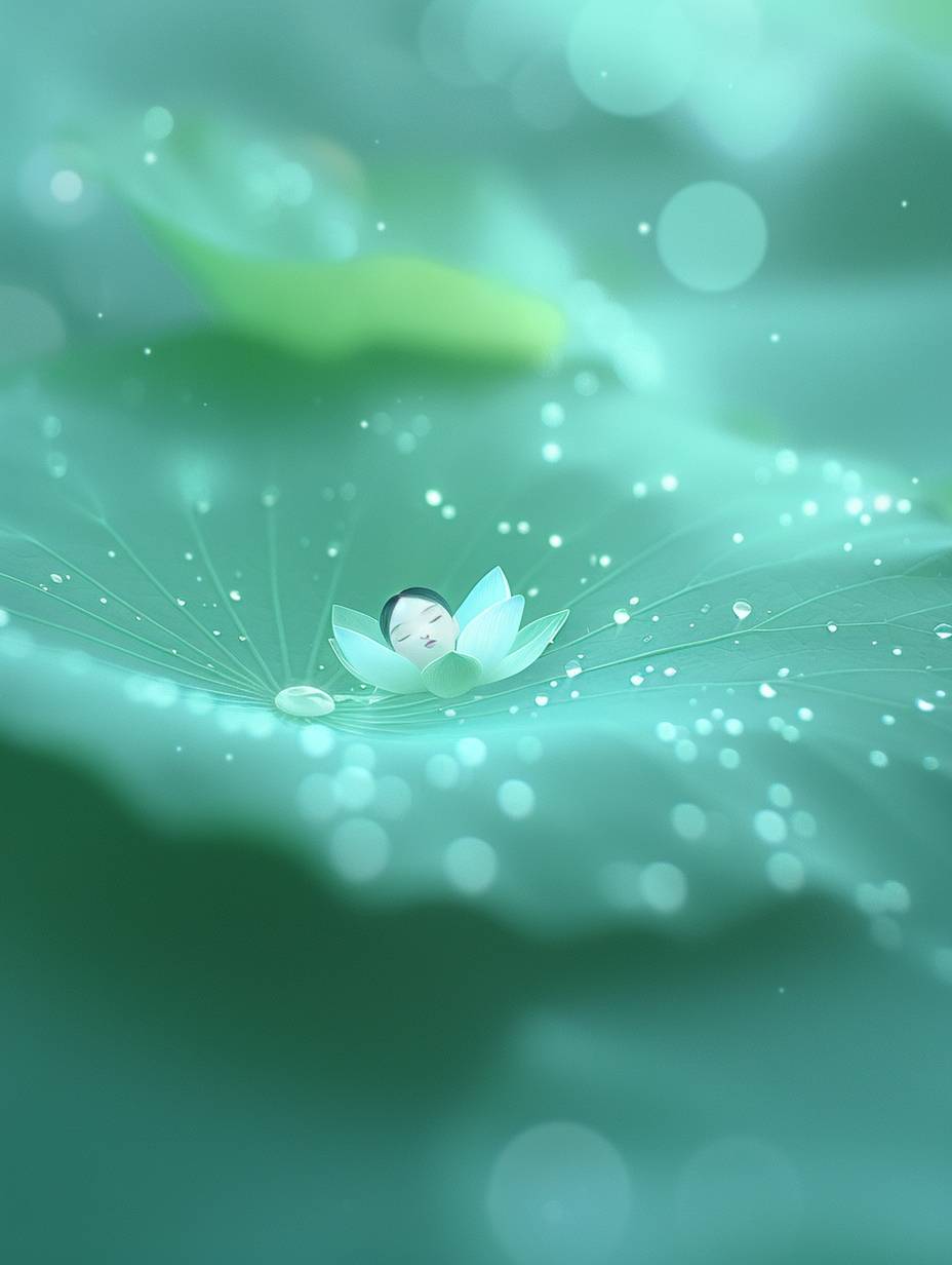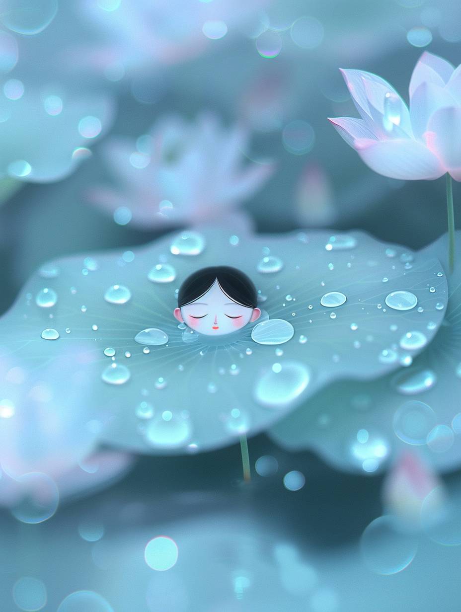 Lilliput illustration, China, tiny girl lying on lotus leaf, microscopic, translucent, soft red, full of water drops, HD. --ar 3:4 --personalize tqk2dar --stylize 750 --v 6.0