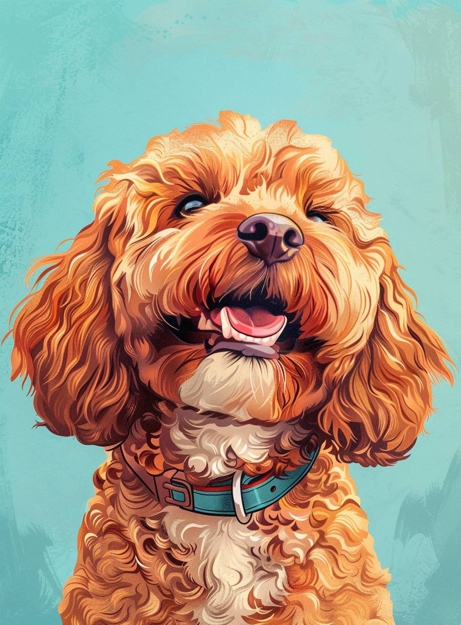 wide smiling Cavapoo, close eyes vintage poster style in the style of Wes Anderson, cute and quirky, happy and smiling, detailed and realistic, bright colours, simple design, light blue background --ar 14:19 --v 6.0