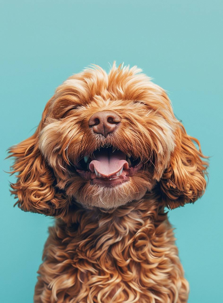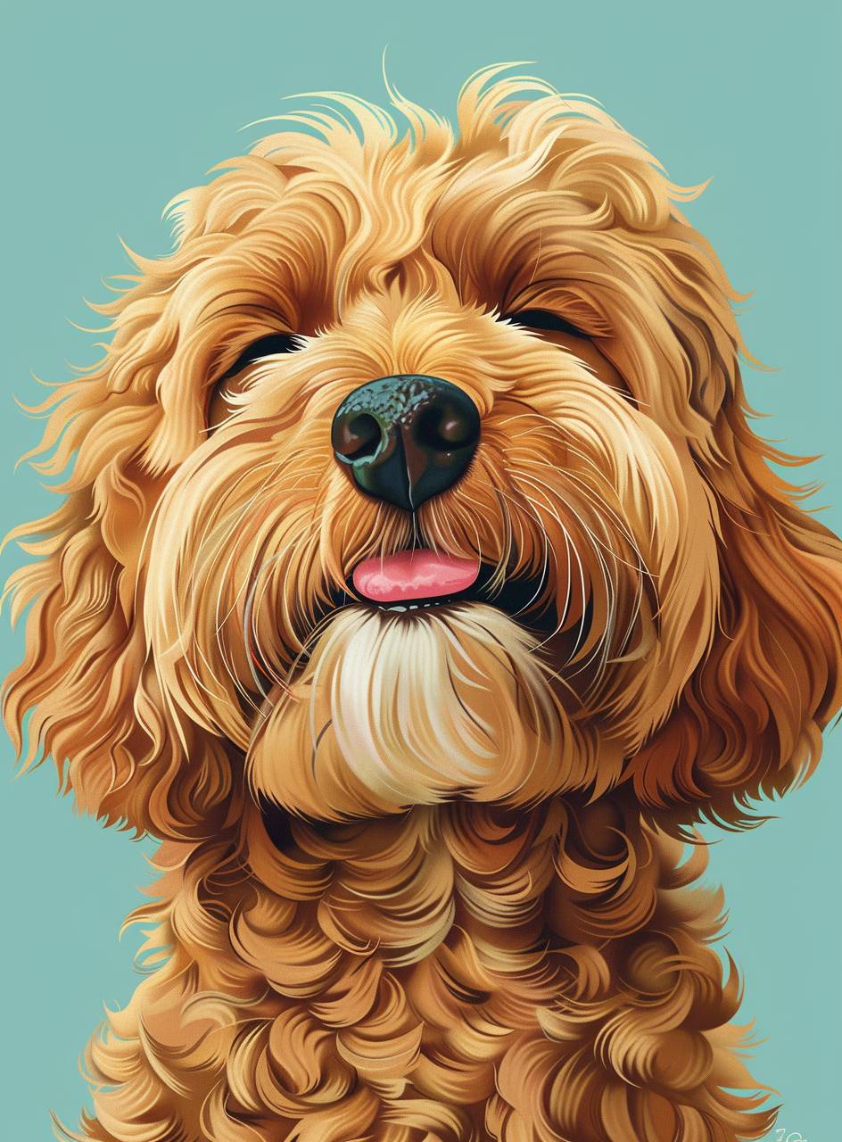 wide smiling Cavapoo, close eyes vintage poster style in the style of Wes Anderson, cute and quirky, happy and smiling, detailed and realistic, bright colours, simple design, light blue background