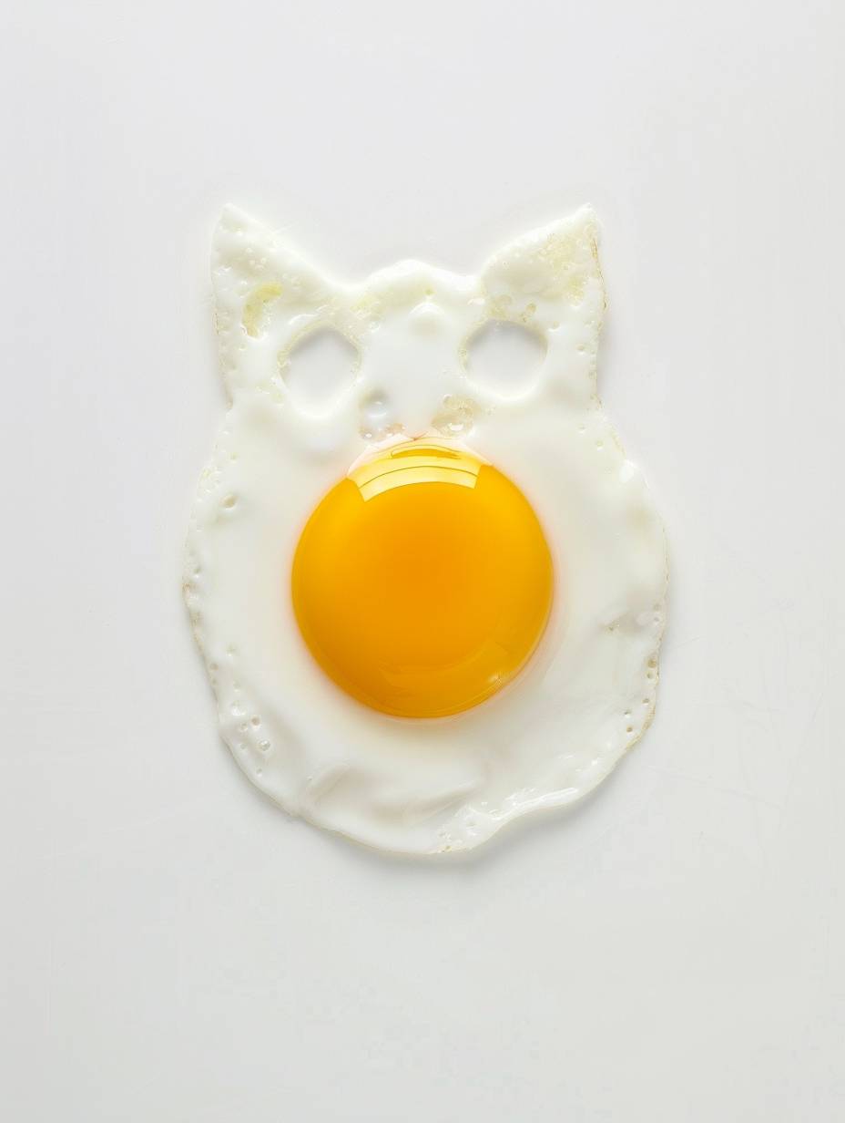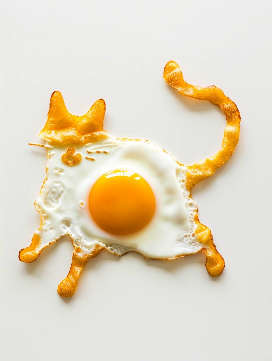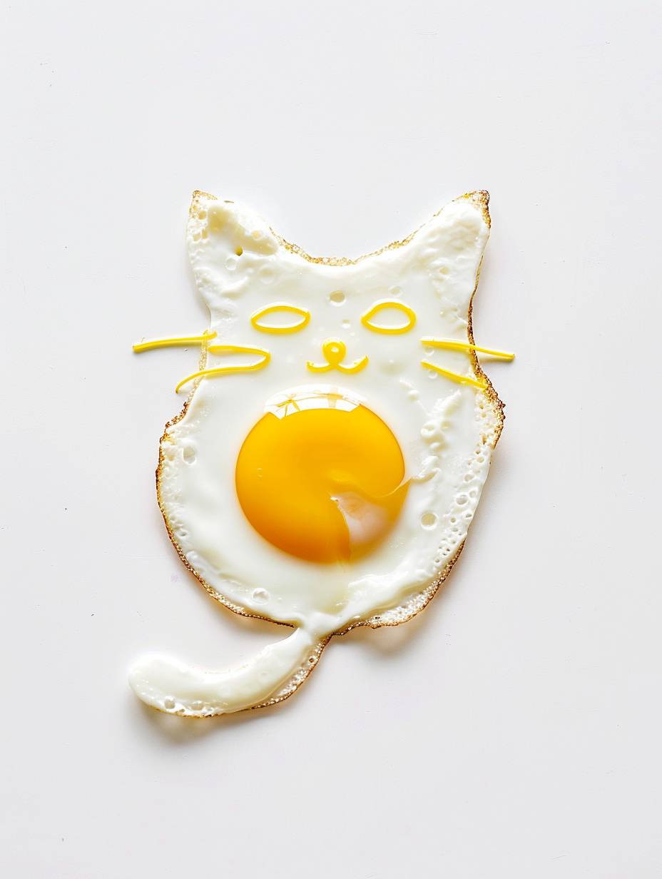 a fried egg in the shape of a cat, white background, food photography, studio lighting, minimalism, simple, surrealistic