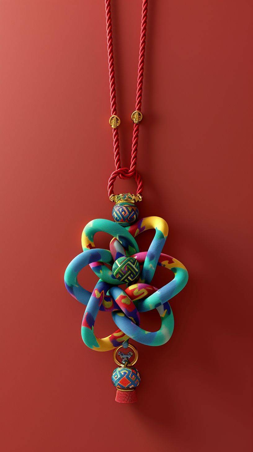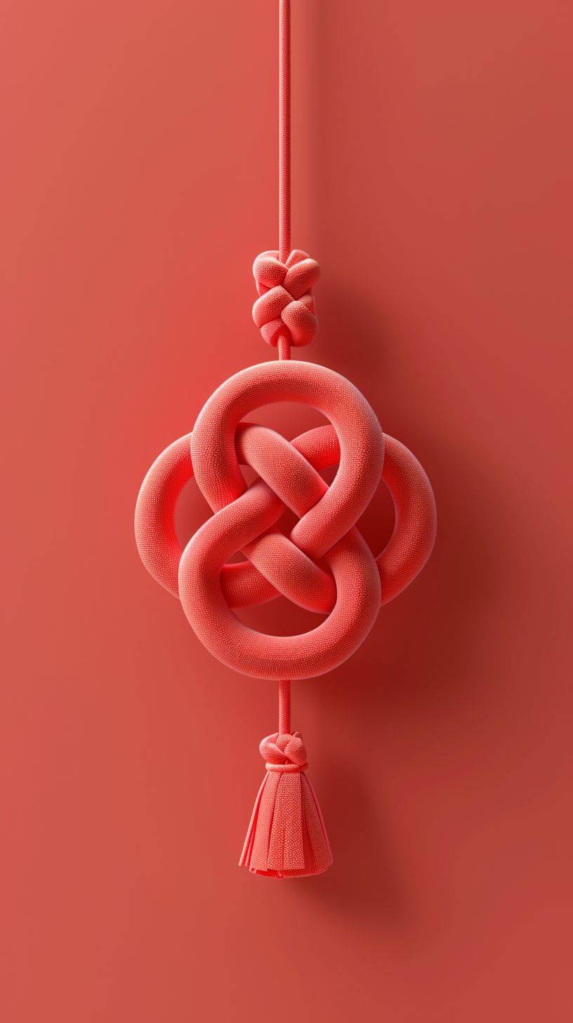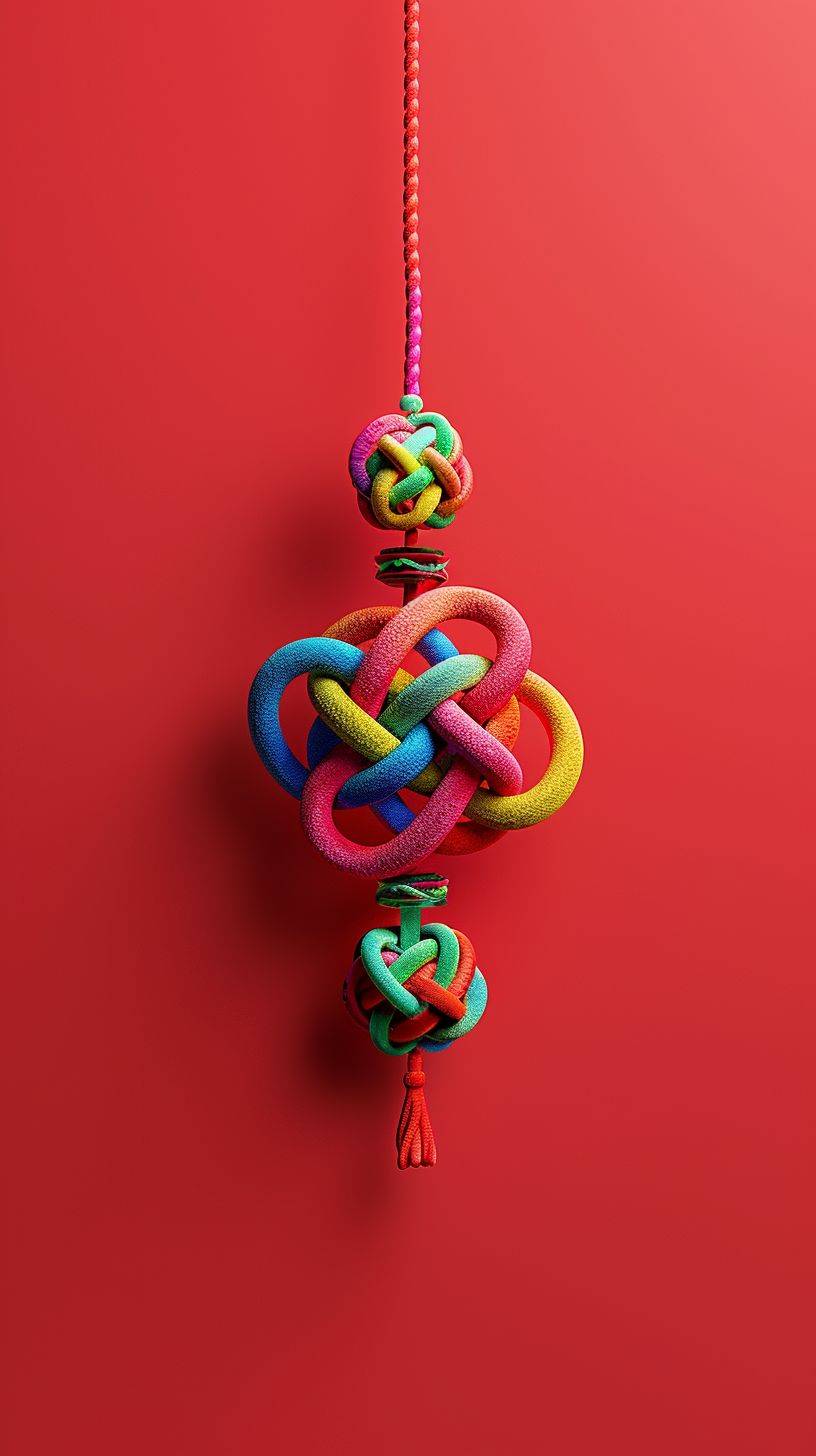 Colorful Chinese Knot Chinese knot pendant , minimalist style, simple clean light red background, movie lighting, volume light, soft and advanced colors, Bubble Mart, 3D, C4D, super detail, super precision,festive --ar 9:16