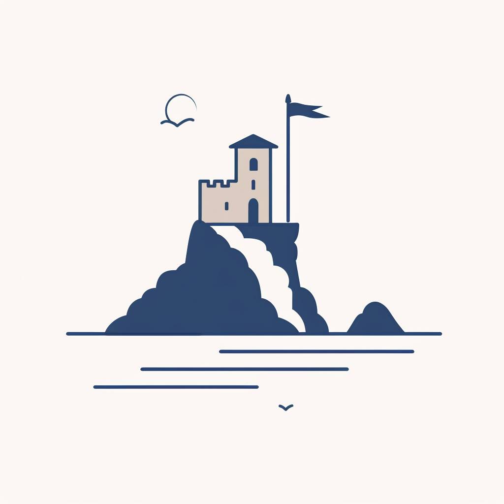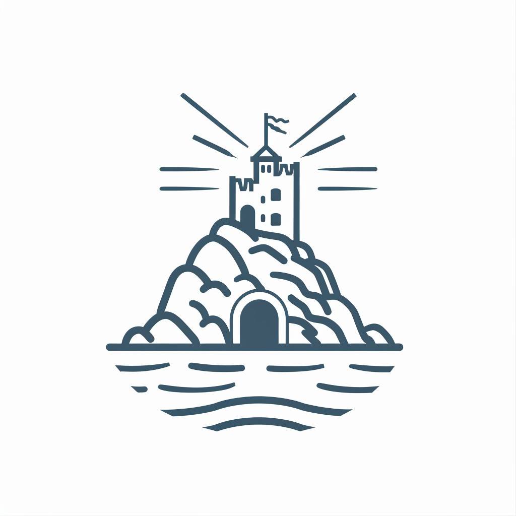 Create a single, extremely simple and minimalistic logo for a website named rent-lloret.com, offering apartment rentals in Lloret de Mar. an old castle sits on top of the ocean in lloret de mar. The design should be neutral and monochromatic, reflecting a minimalistic approach with a professional and trustworthy image suitable for the real estate market. Emphasize the concept with a single color, possibly through an abstract representation of waves or the sun, to suggest the coastal location while maintaining simplicity and universality.