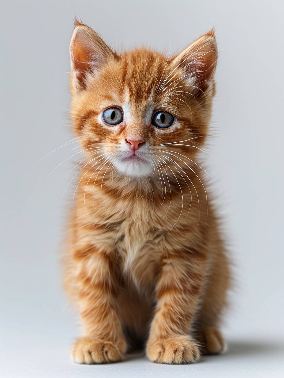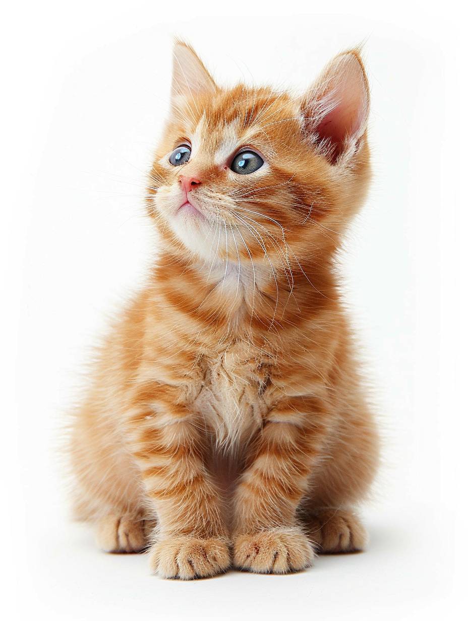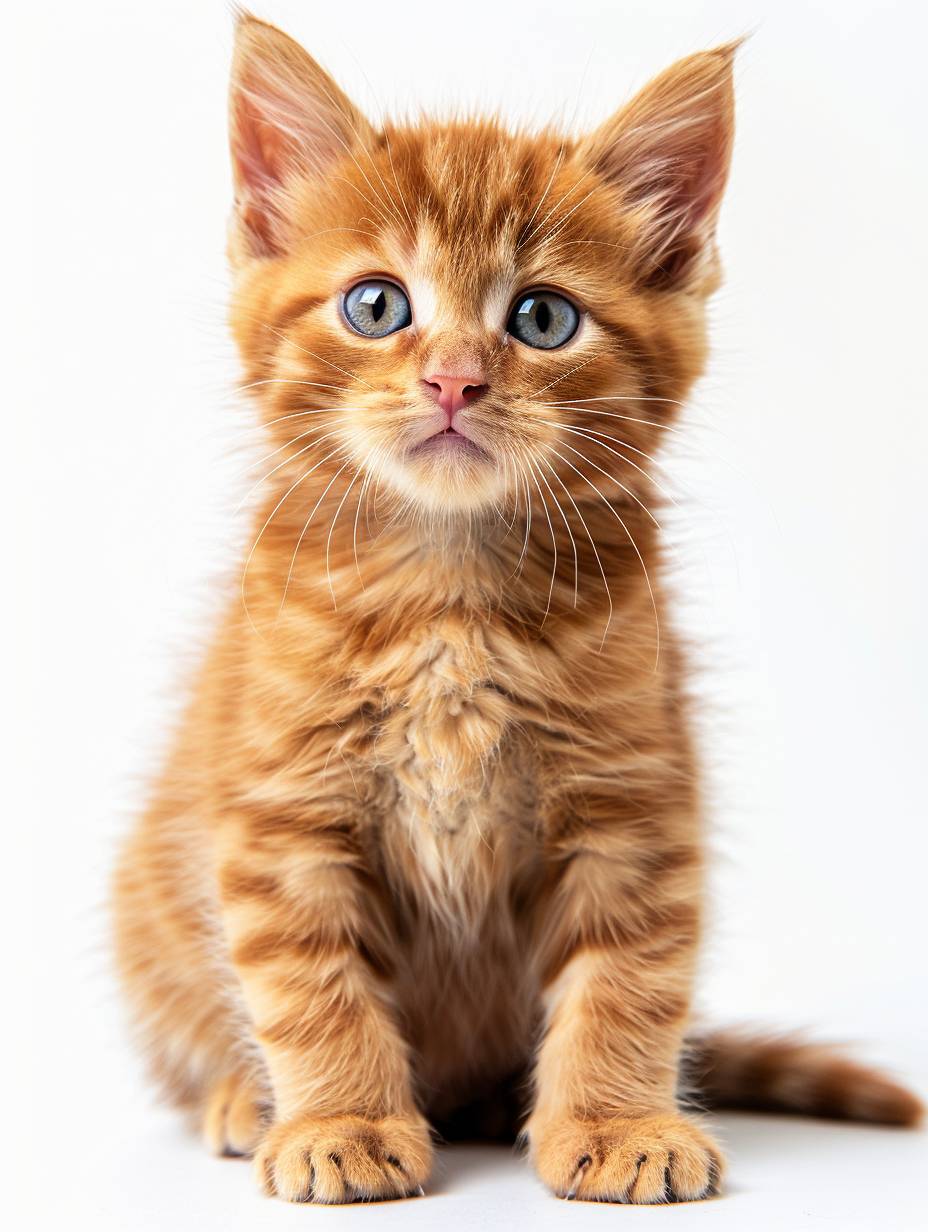 cute orange kitten, cute, adorable, full body shot, precise and lifelike, isolated on plain white background, high resolution photo, natural lighting