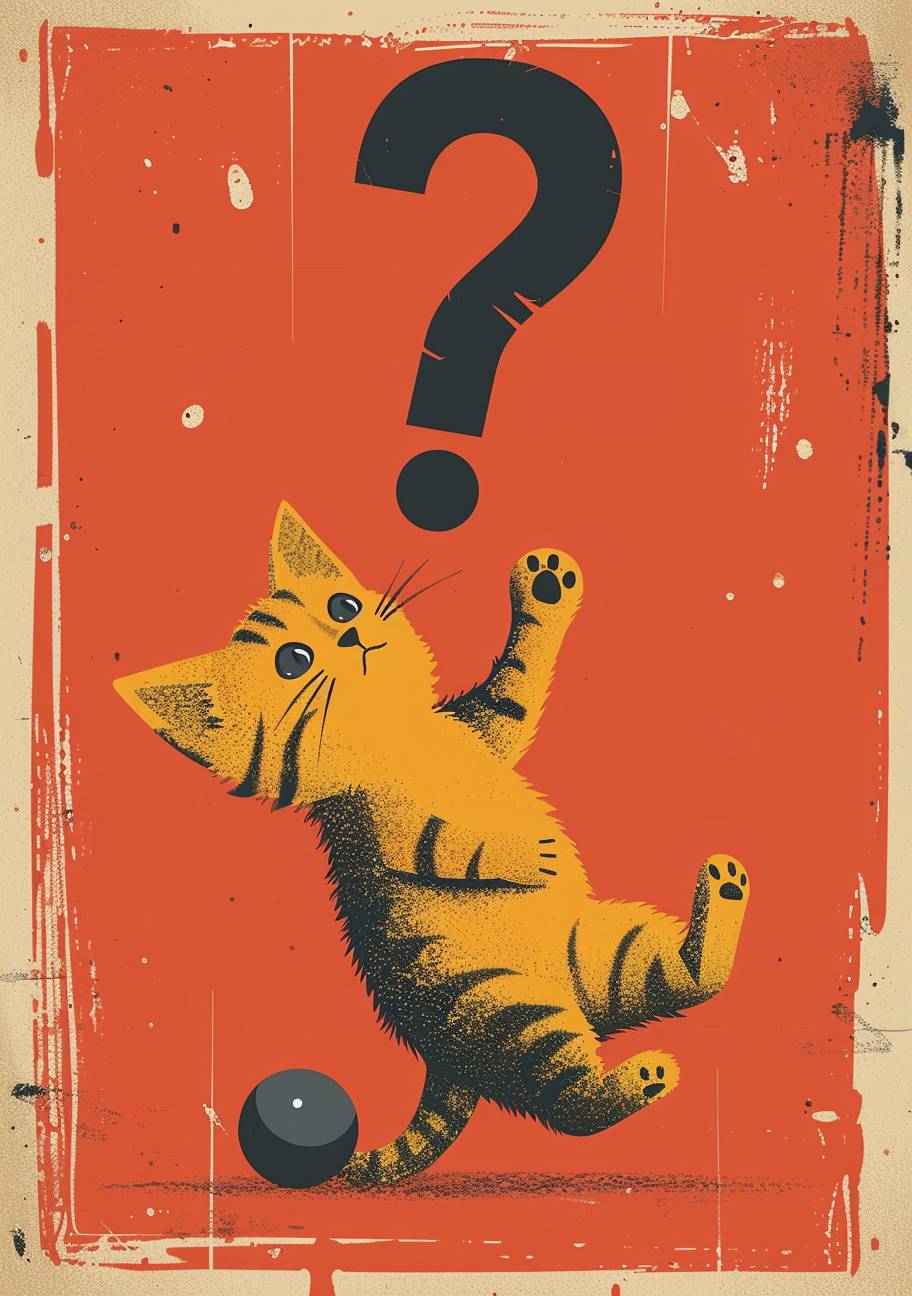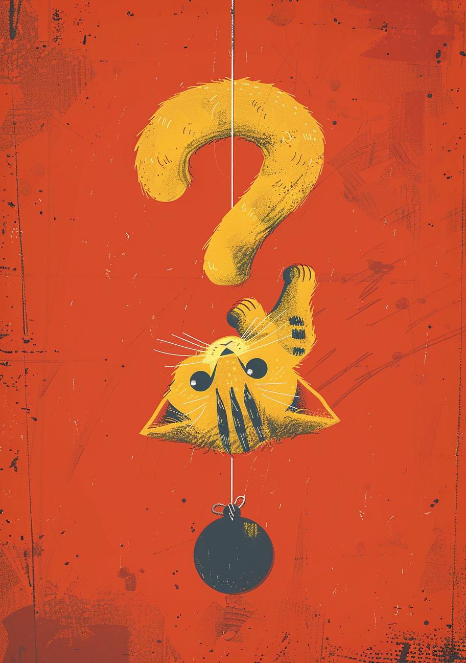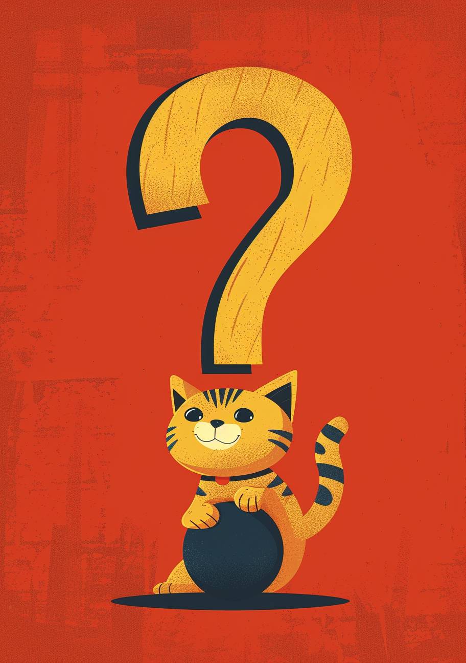 A yellow cat with black stripes is climbing on top of the question mark, vector illustration style, simple lines, flat design, red background, simple details, bright colors, cartoon character, cute and adorable, warm atmosphere. A dark blue ball lies at its feet below. The yellow kitten hangs upside down from one end to emphasize in the center of an empty space above it. It has four legs and two ears hanging straight ahead. by John Holcroft for his book cover, --ar 68:97 --stylize 250 --iw 2 --v 6.0