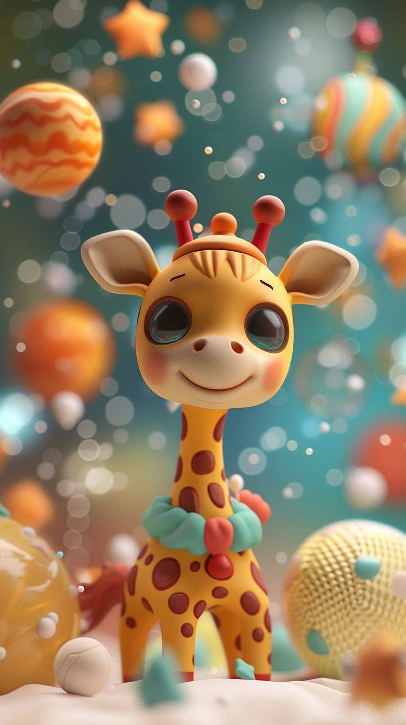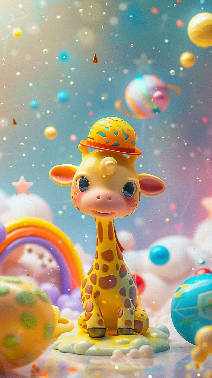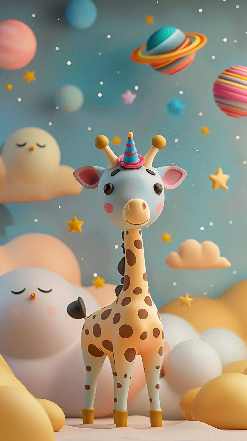 focus, chibi, dreamlike, cute giraffe wearing a hat dancing, stars, planets, rainbow, moon, colorful, bright Morandi colour scheme, playful color, 3D, soft sculpture, minimalist, all in the style of cartoonish, --ar 9:16