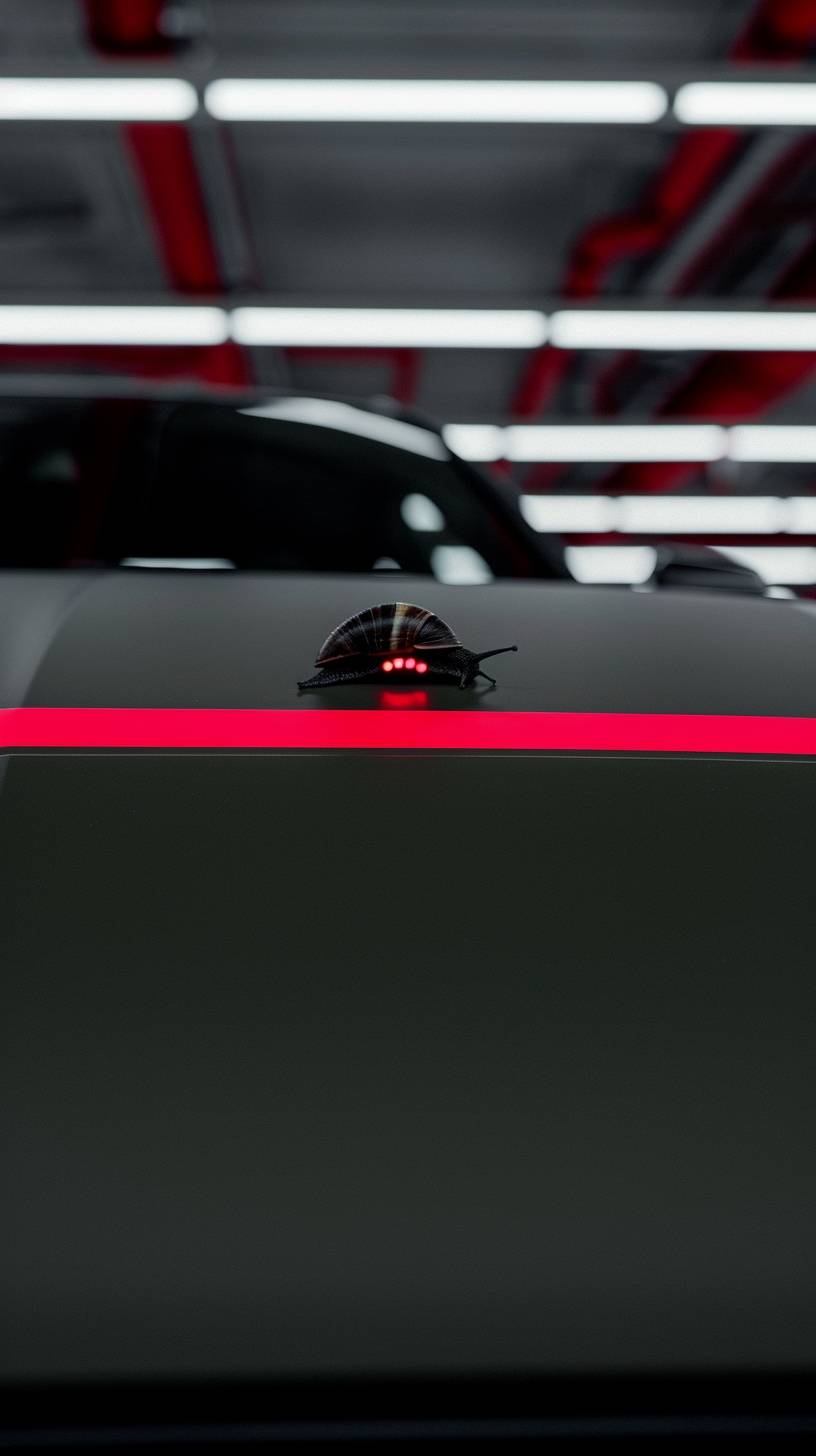 Close-up view of a snail on the hood of a concept BMW car, captured by a professional photographer. The car is painted in a military style. Lighting similar to a nightclub with dynamic, colorful, and dramatic neon lights, creating a striking and trendy atmosphere. Hyper-realistic and detailed imagery, with the snail in sharp focus against the backdrop of the sleek, high-end design of the BMW hood. The urban night scene or futuristic backdrop should subtly enhance the dramatic effect of the lighting --ar 9:16 --style raw --personalize jrrhhoi --stylize 750 --v 6.0