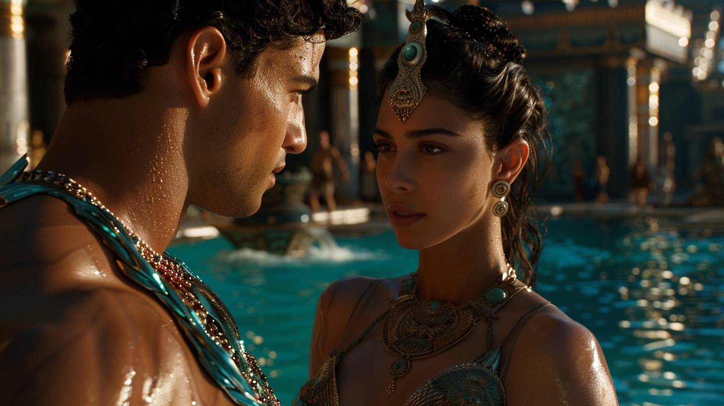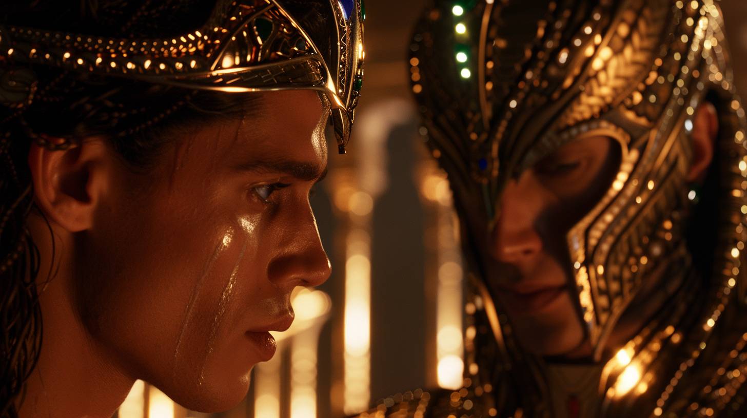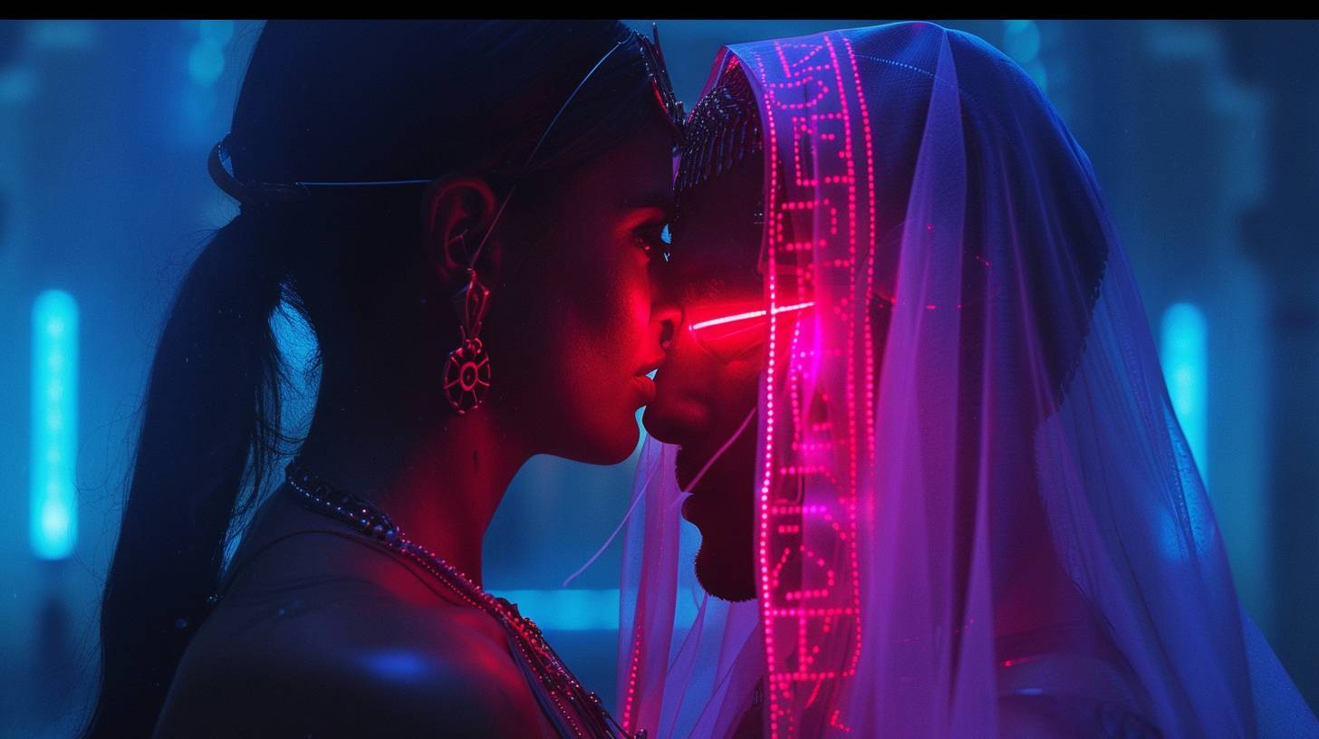 a cinematic screengrab of Hades & Persephone reimainged, ancient greece, cyberwarrior of the future --ar 16:9 --personalize 7zc9cc5 --stylize 1000 --v 6.0