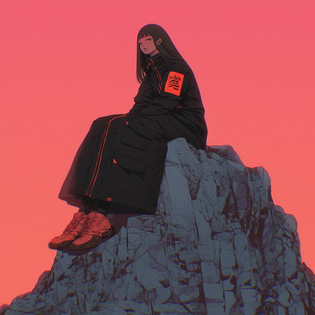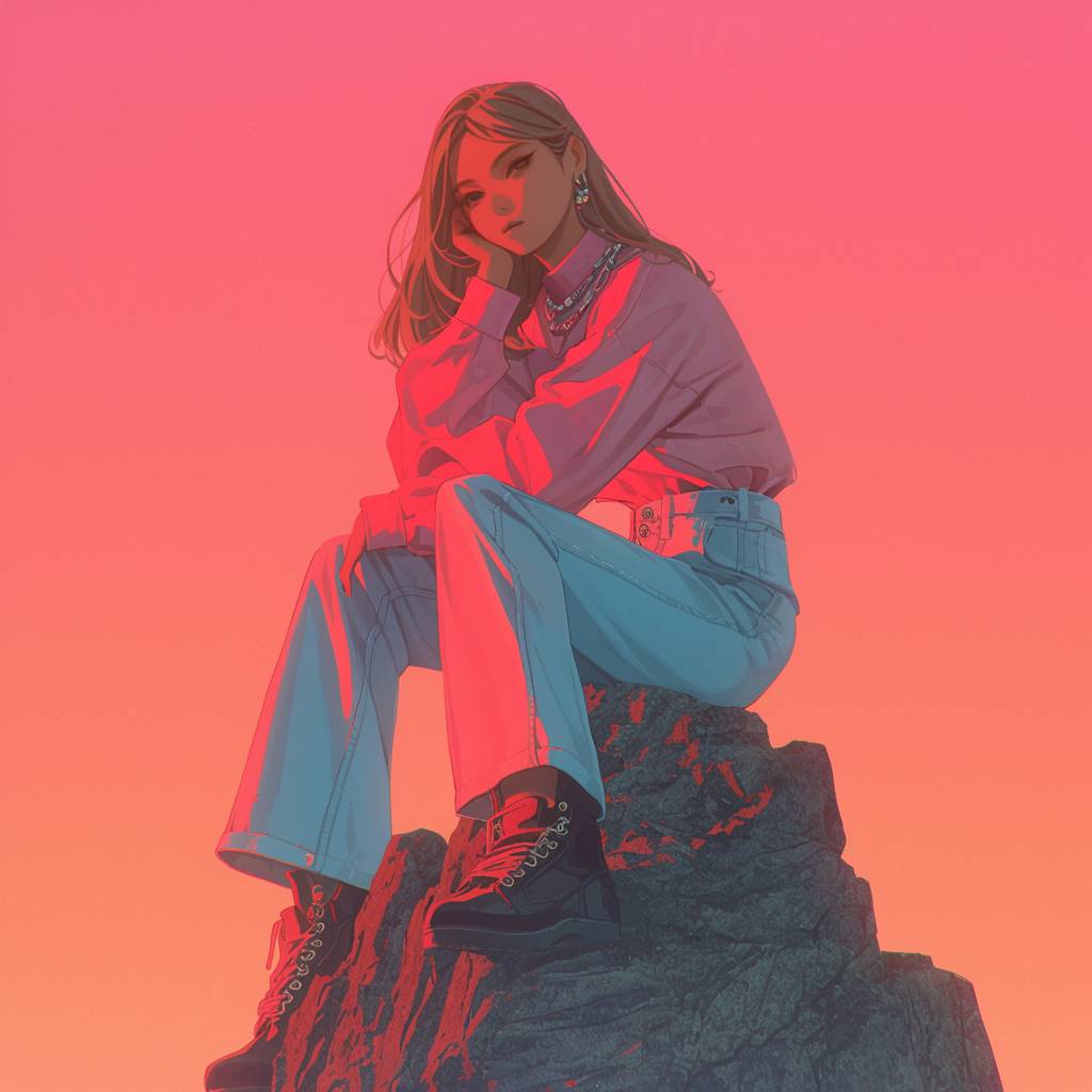 a female model sitting on top of a large rock --sref 499 --niji 6 --stylize 1000