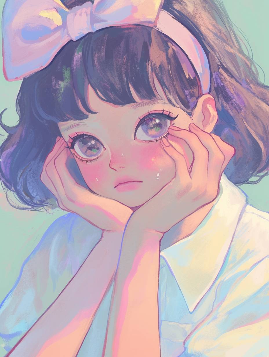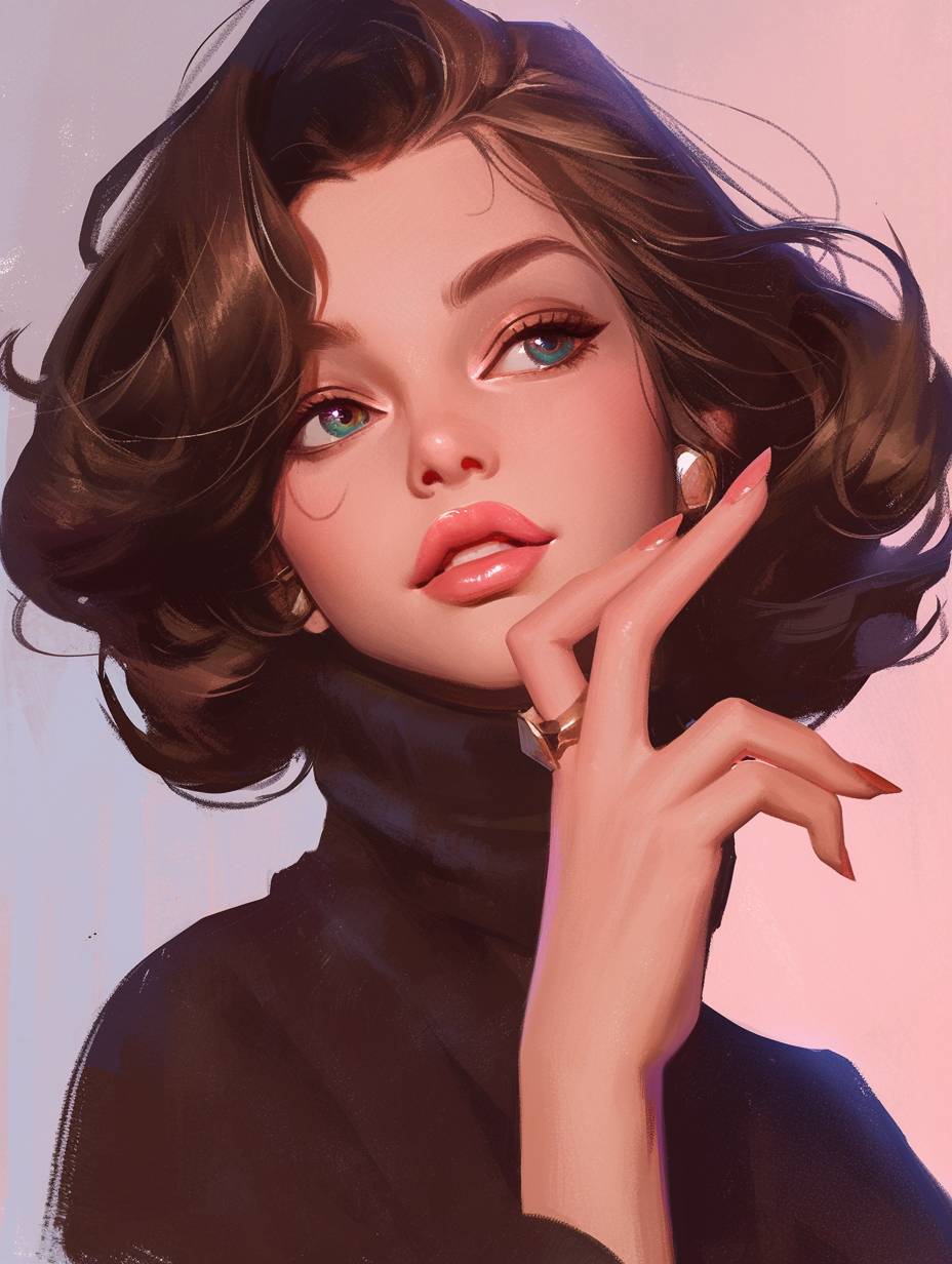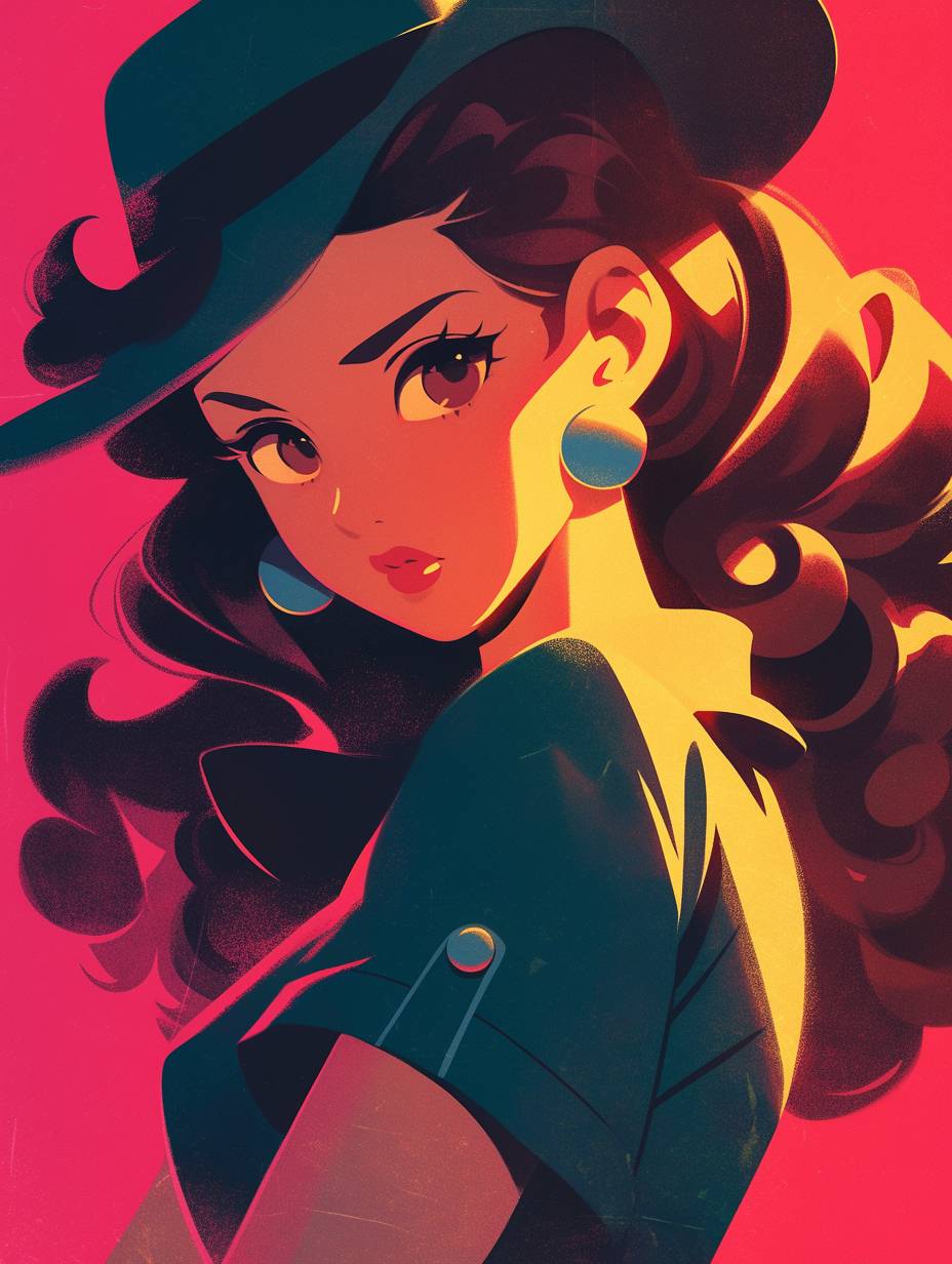 retro [subject] character illustration, closeup, 1930's, disney style, retro vintage, [action], [subject] in background, iridescent colors, bright muted color background, --ar 3:4 --niji 6