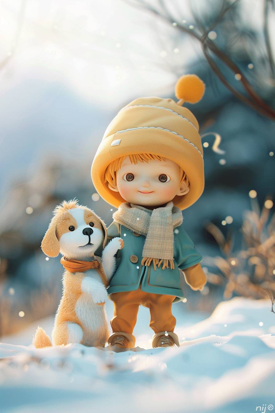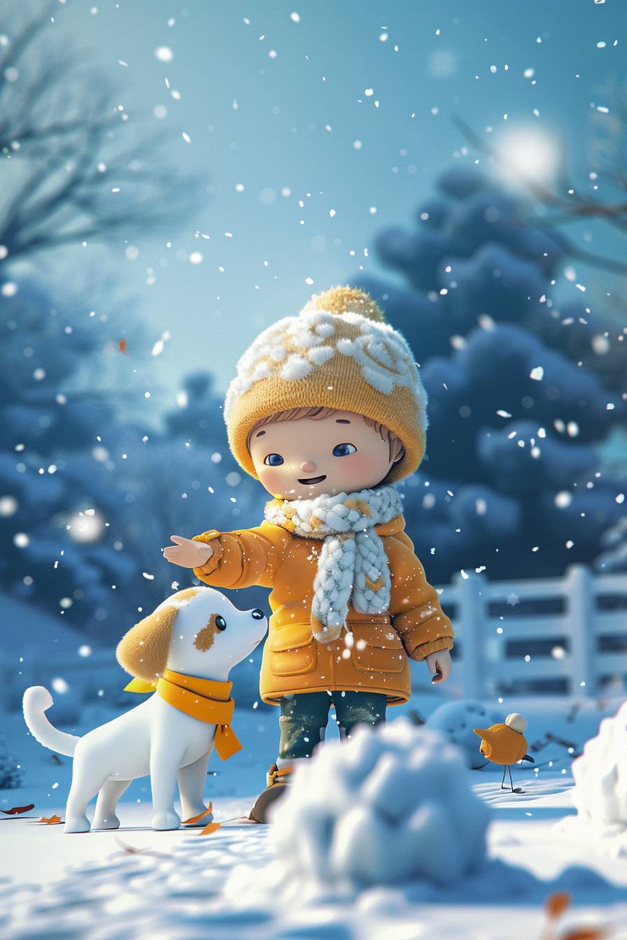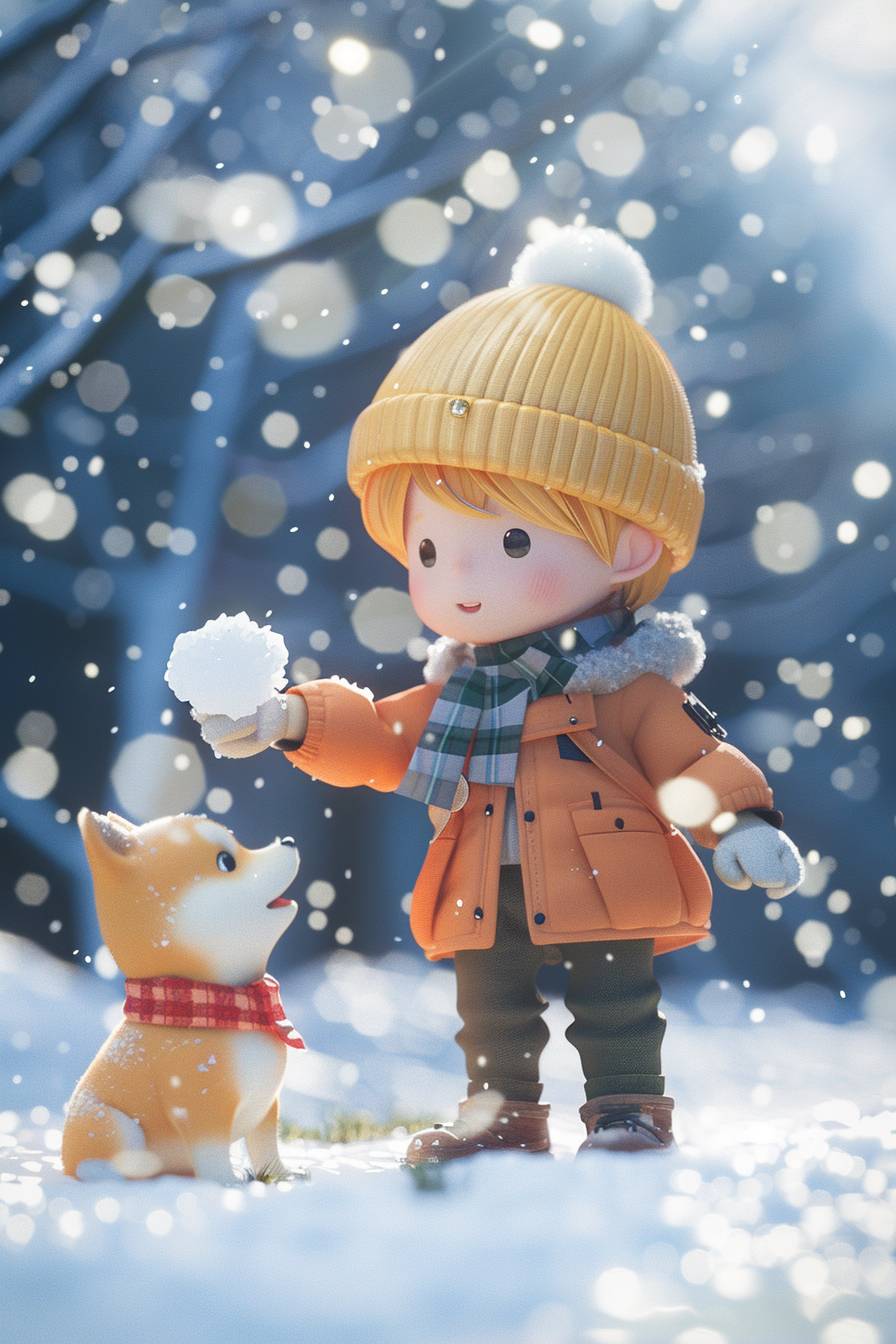 3D rendering, C4d, blind box design,A cute little boy with cartoon Q version, short yellow hair, Wear winter clothes,Have a snowball fight with a puppy in the snow--niji6 --ar 2:3 --v 6.0