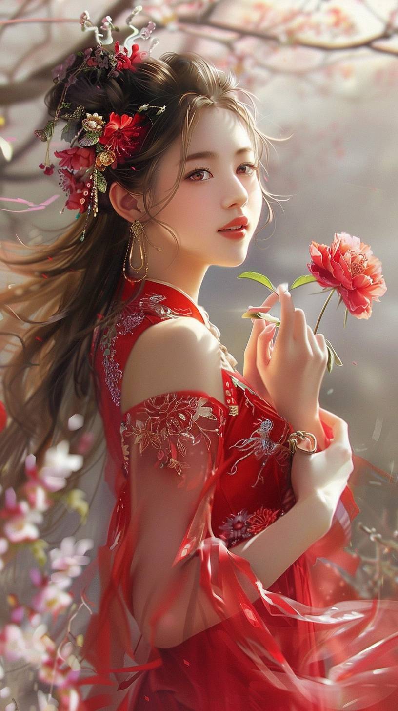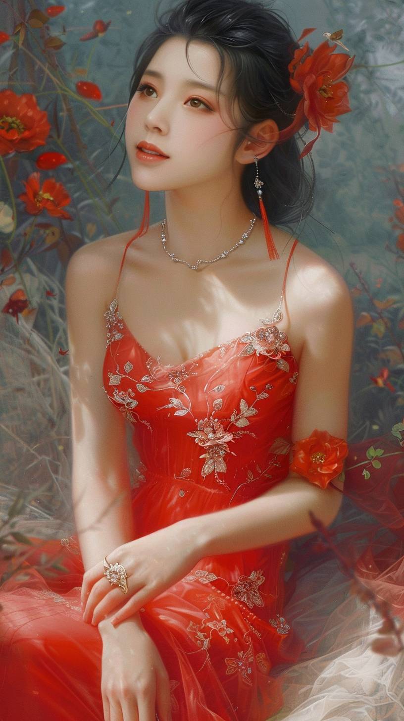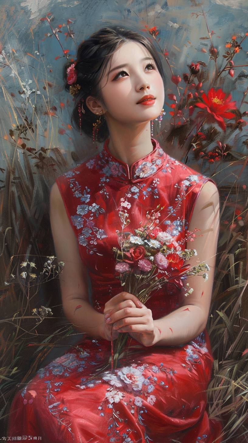 A beautiful Chinese girl in a red dress, holding flowers in her hands, looking up and smiling at the camera, creates a dreamy atmosphere. This painting is in the style of a romantic landscape oil painting, with light silver color matching, elegant posture, elegant floral decorations, natural elements, and delicate textures. --ar 9:16 --v 6.0