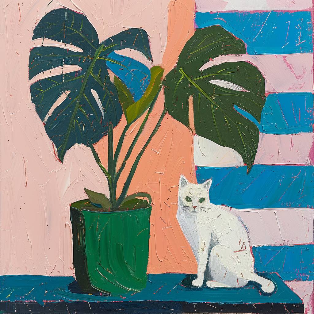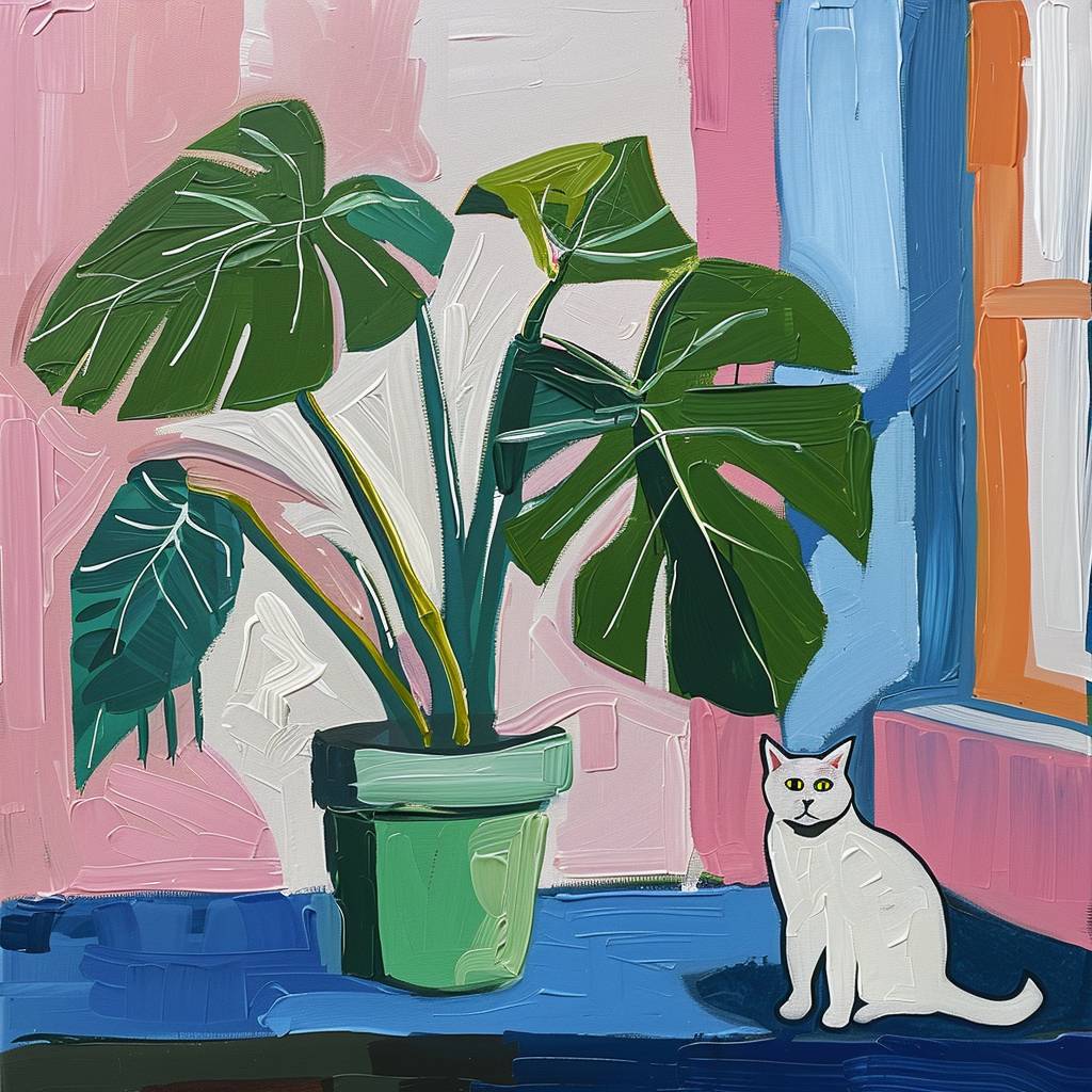 An oil painting of a monstera plant in a green pot, with blue and pink stripes on the sides of the picture, with a white cat sitting next to it, in the style of Henri Matisse, with muted colors and a black outline. --v 6.0
