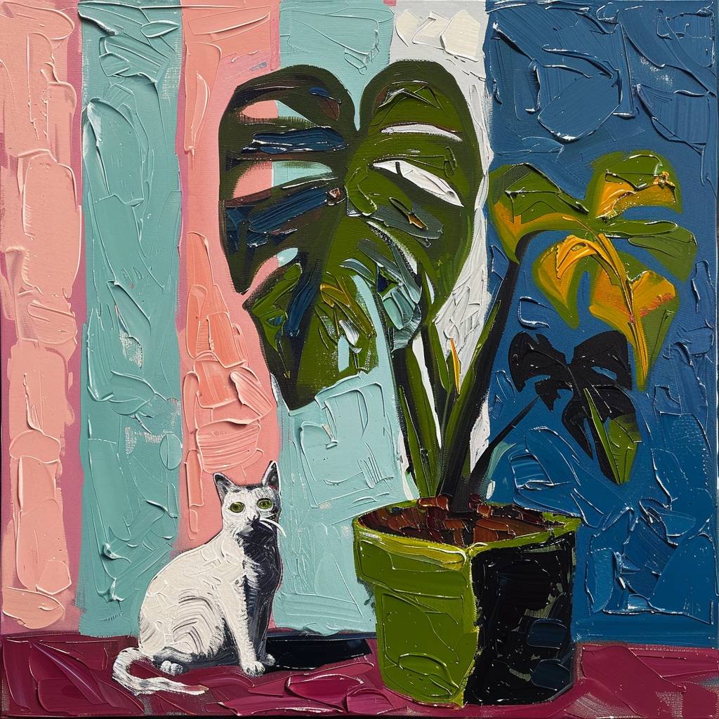 An oil painting of a monstera plant in a green pot, with blue and pink stripes on the sides of the picture, with a white cat sitting next to it, in the style of Henri Matisse, featuring muted colors and a black outline.