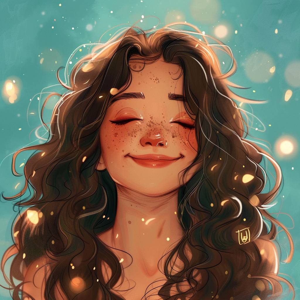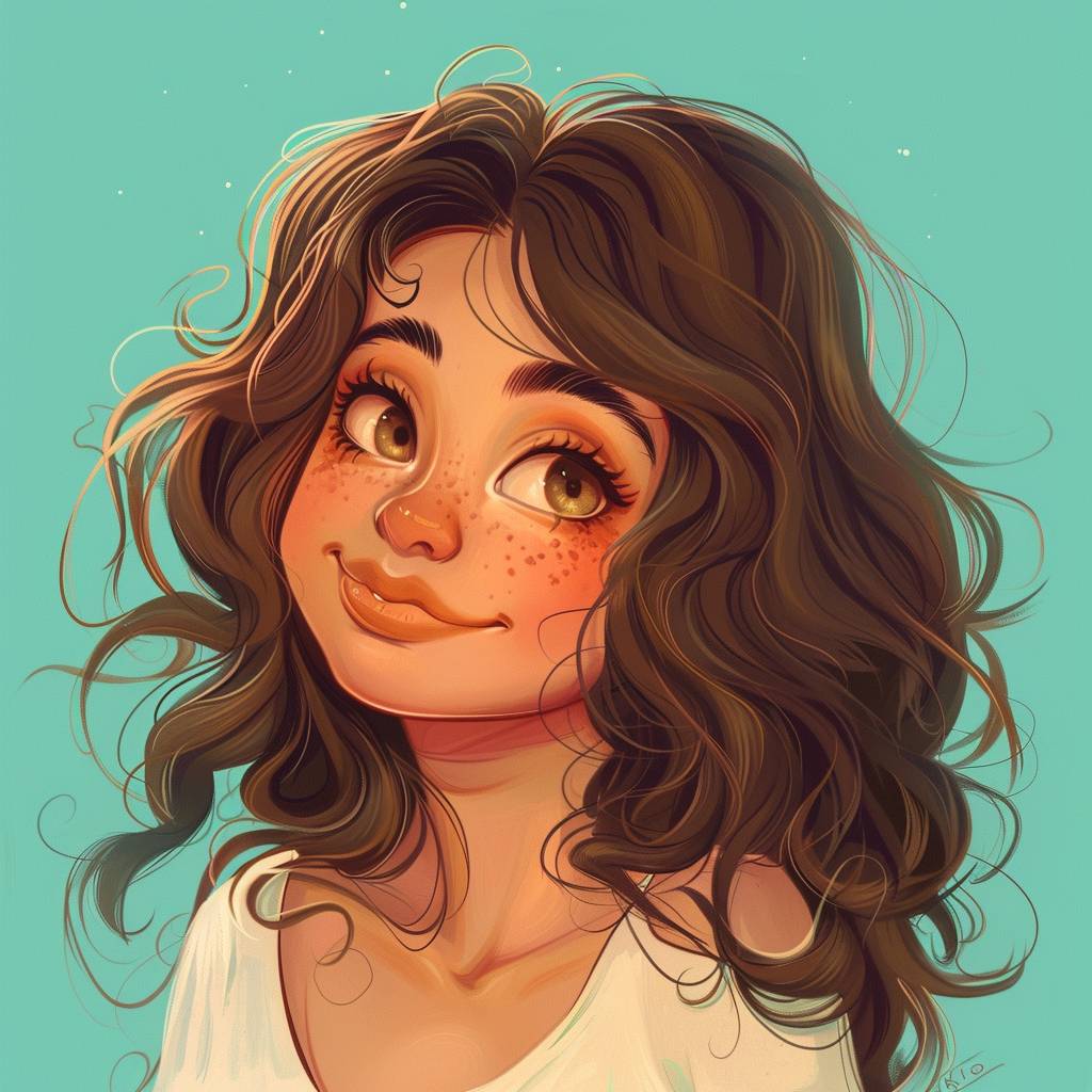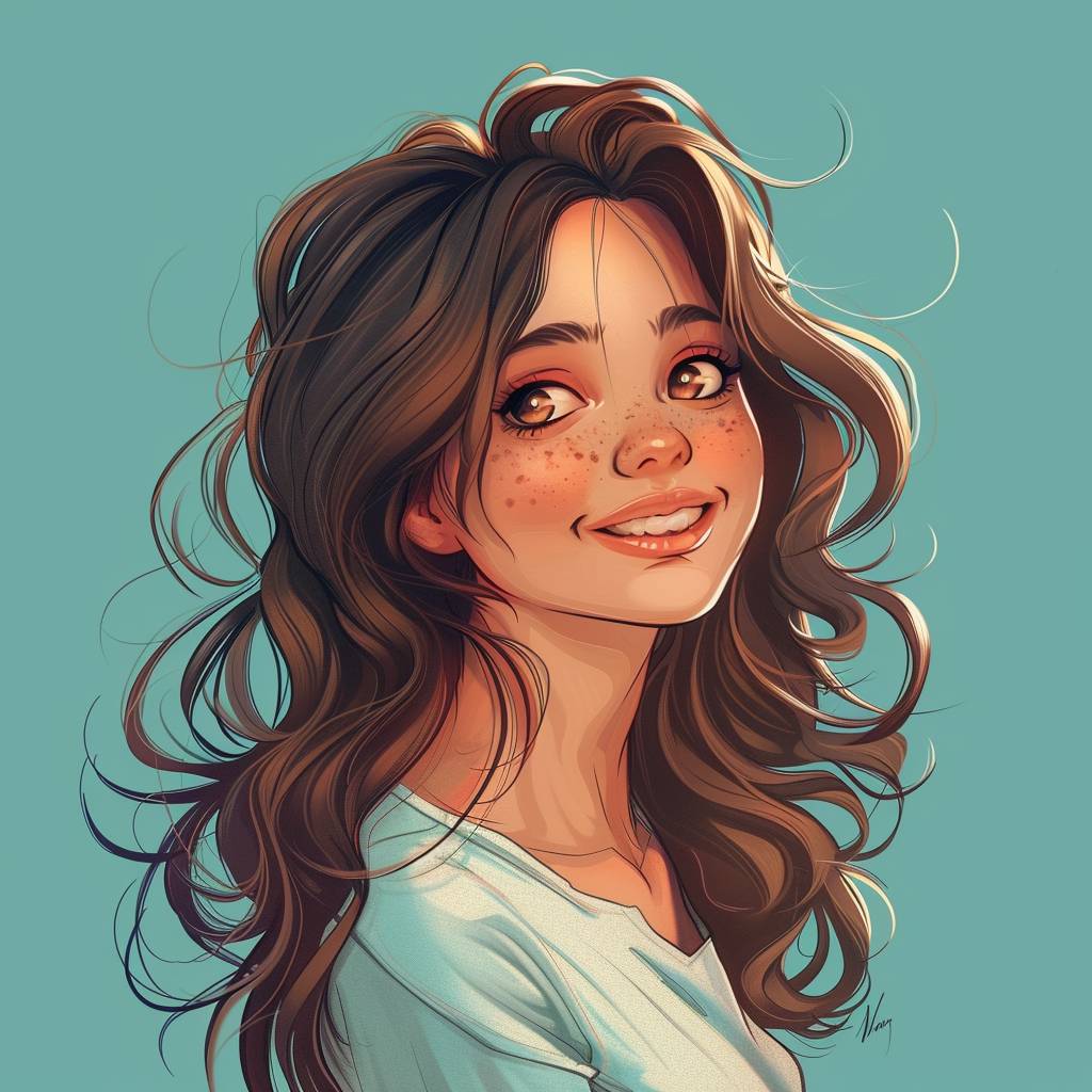 A cute digital art of a girl with wavy hair, blushing cheeks, and a playful smile, set against a teal background. Artist's signature in the corner. --v 6.0