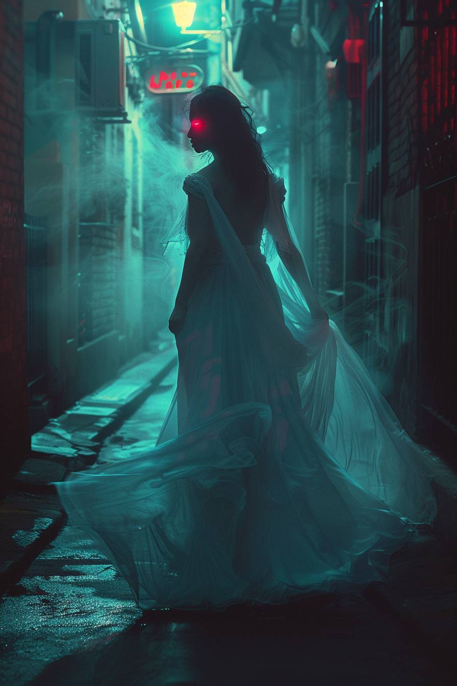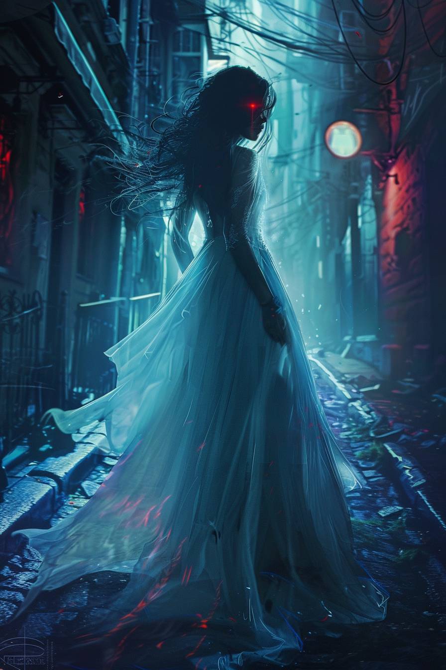 A mesmerizing digital art piece featuring a mysterious woman in a flowing white gown, standing in a dimly lit alley with piercing red eyes.