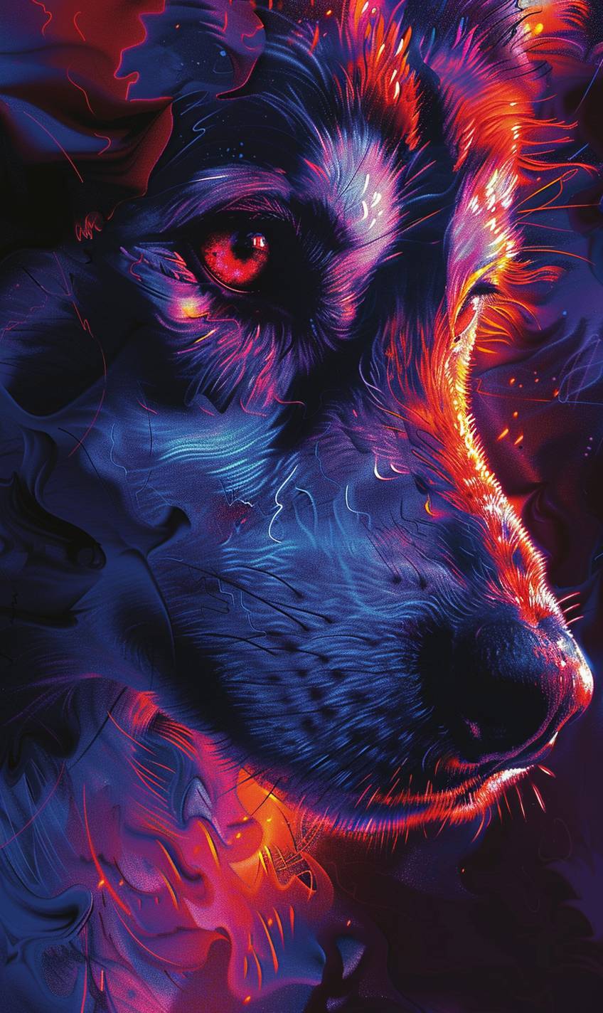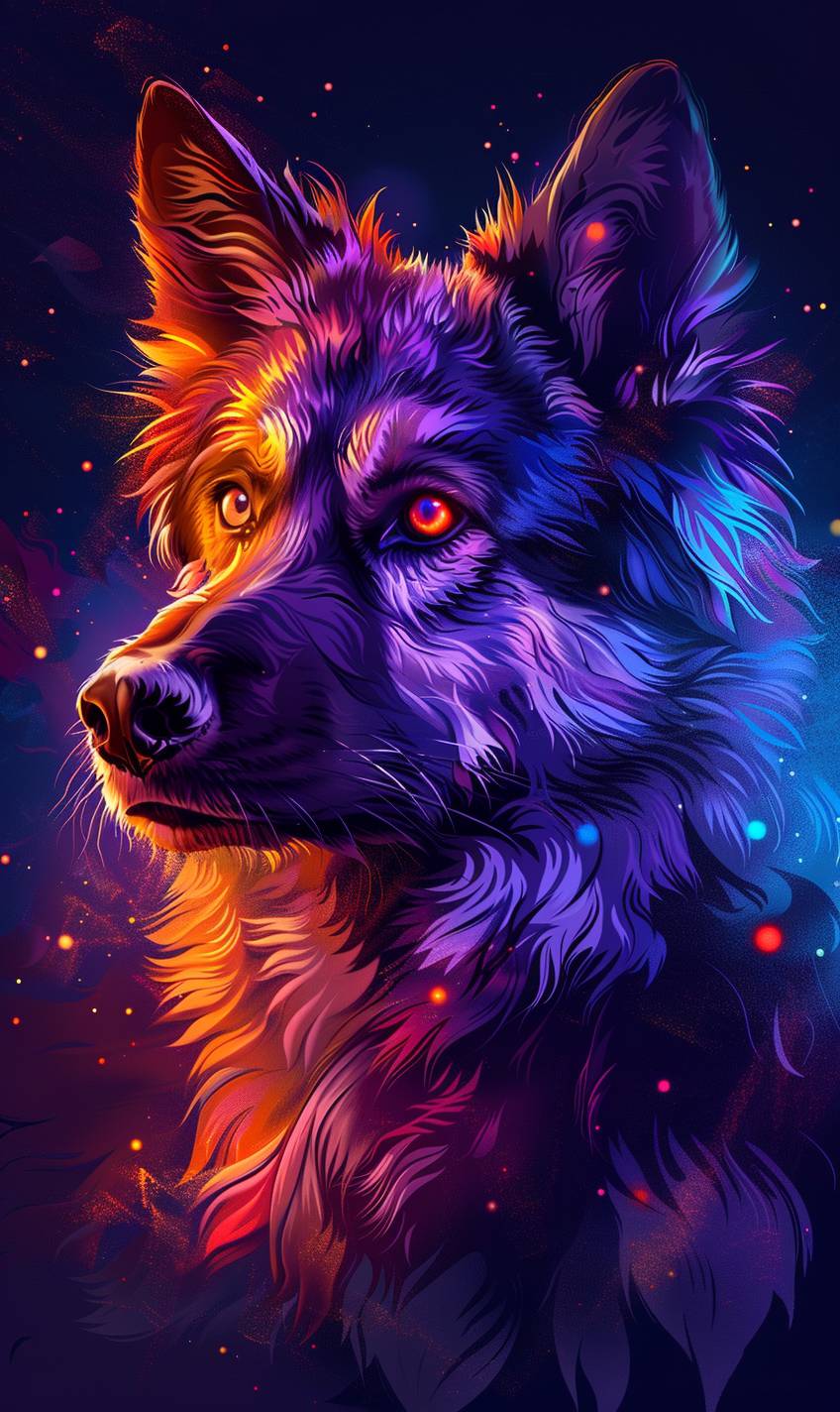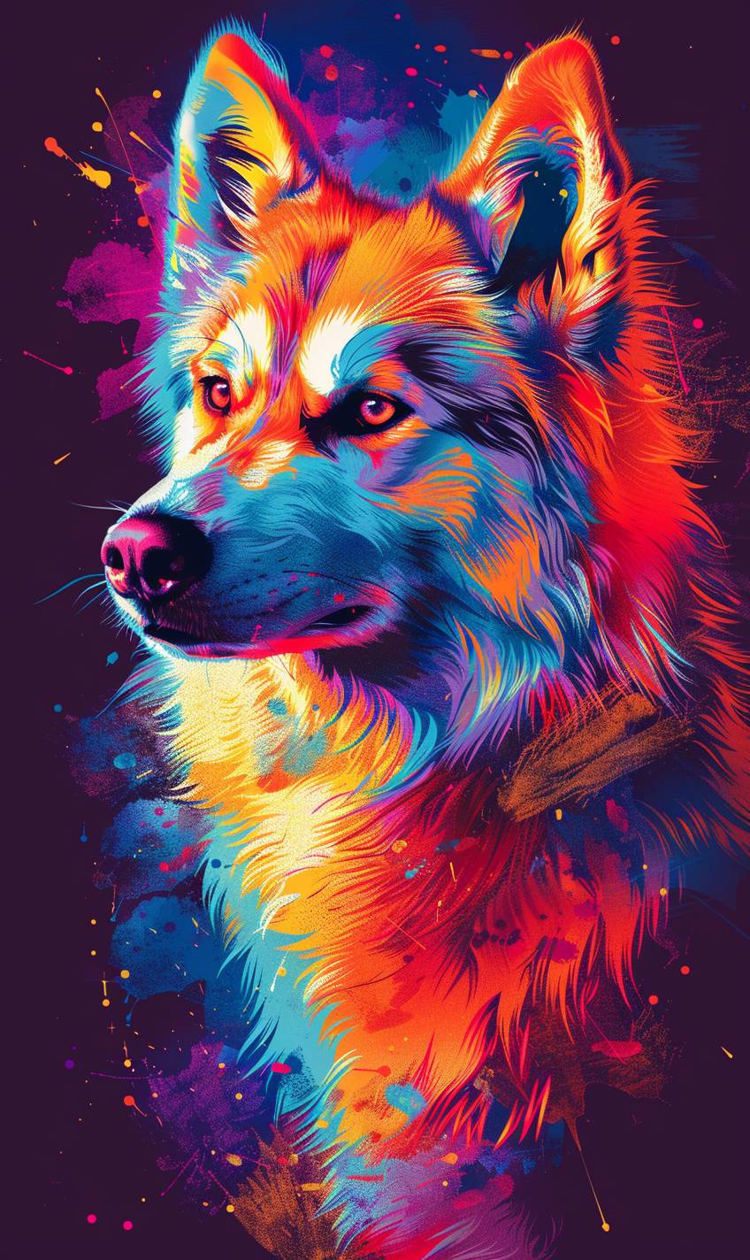 Anime dog in neon colors, strong facial expression