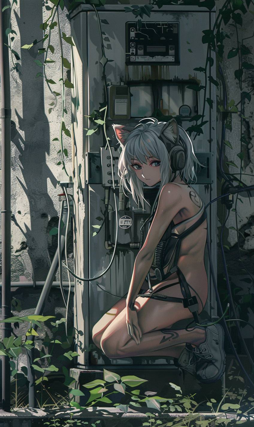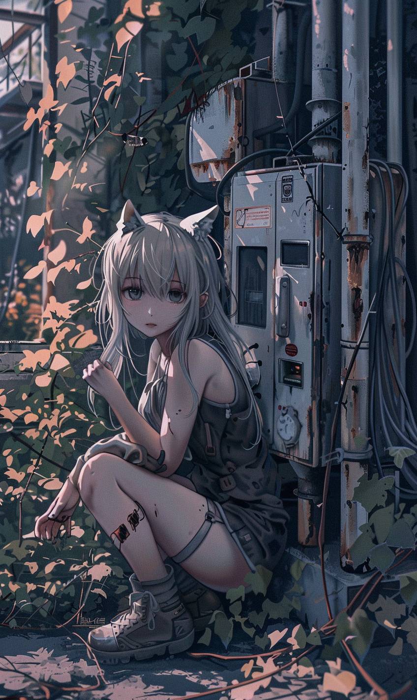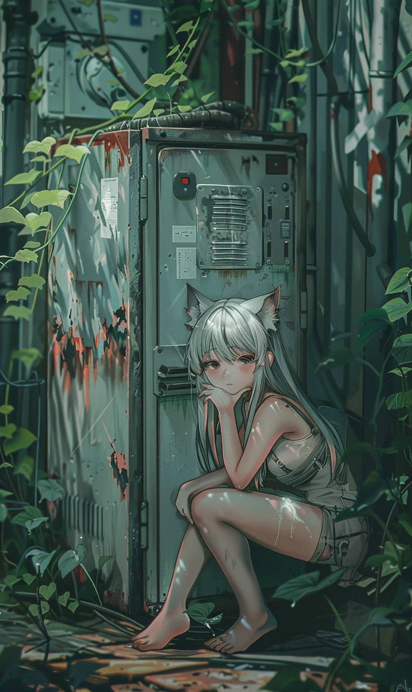 A cute girl with cat ears is crouching next to an electrical box, in the style of Makoto Shinkai, with her full body shown. She has pale skin and silver hair. In the background is an abandoned building covered in vines, with muted pastel colors. It is digital art. --ar 3:5 --v 6.0