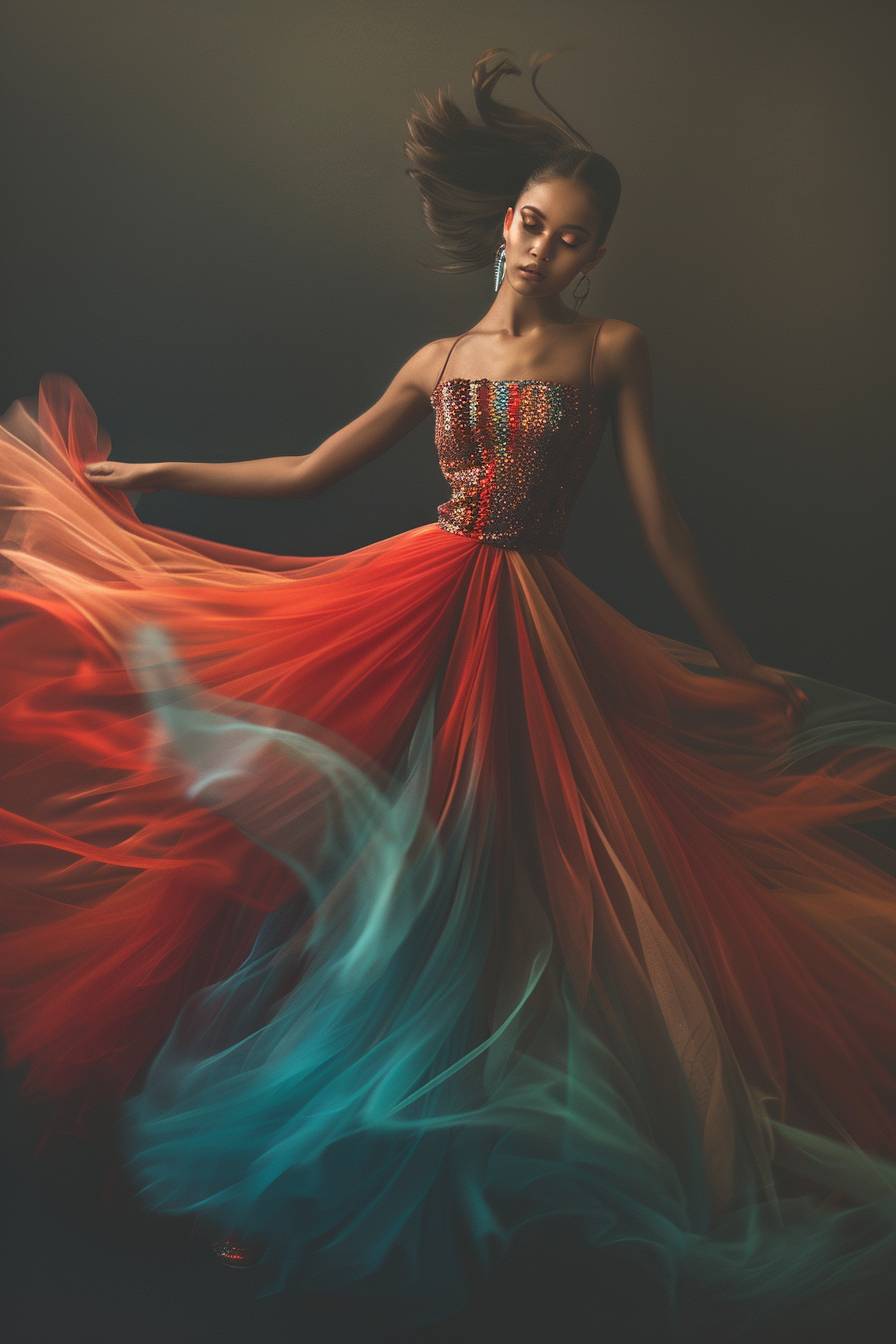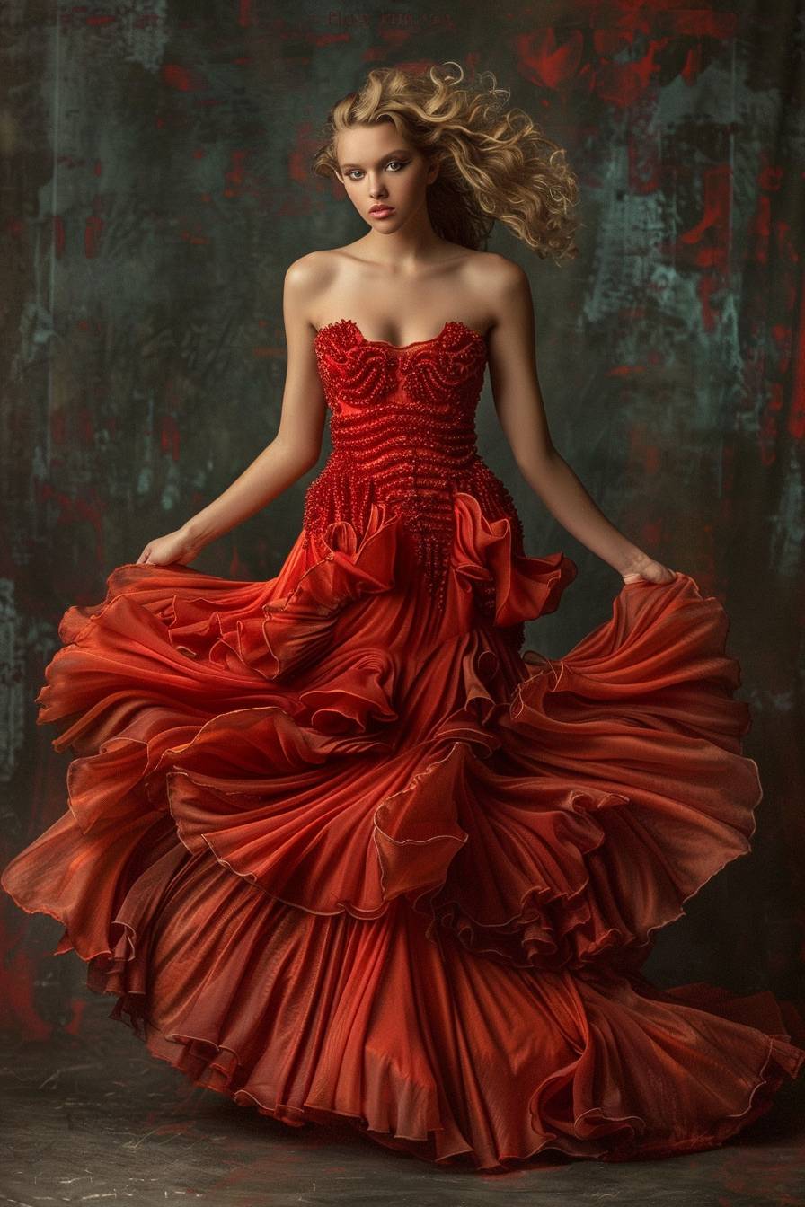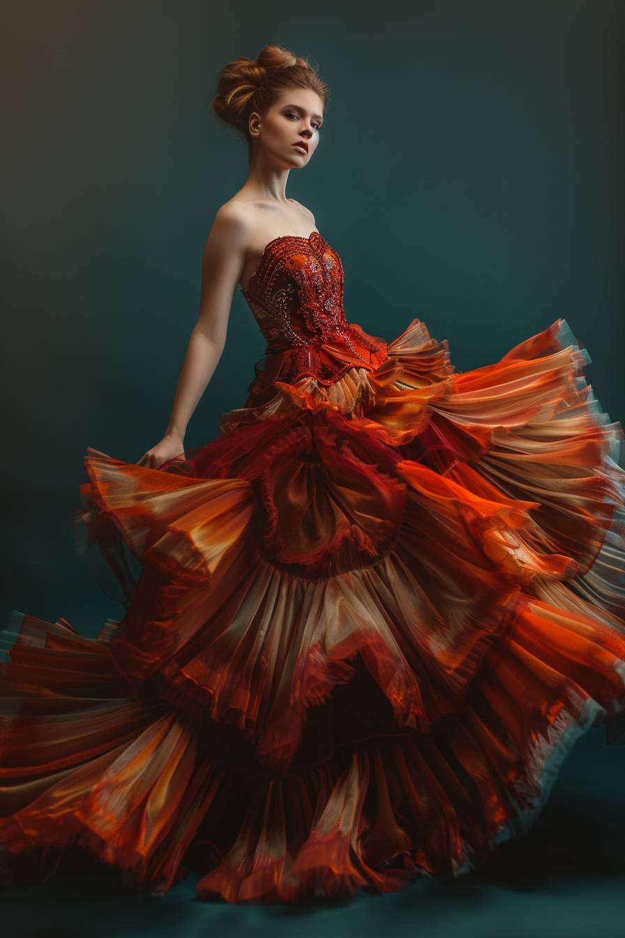A photograph of a young beautiful woman wearing an avant-garde dress inspired by the architecture of the Golden Gate Bridge, photographed in a studio, non-traditional fashion, red inspired color palette with accents of ocean blue, photorealistic, extreme detail, soft studio lighting on the model and the dress, full body photograph.