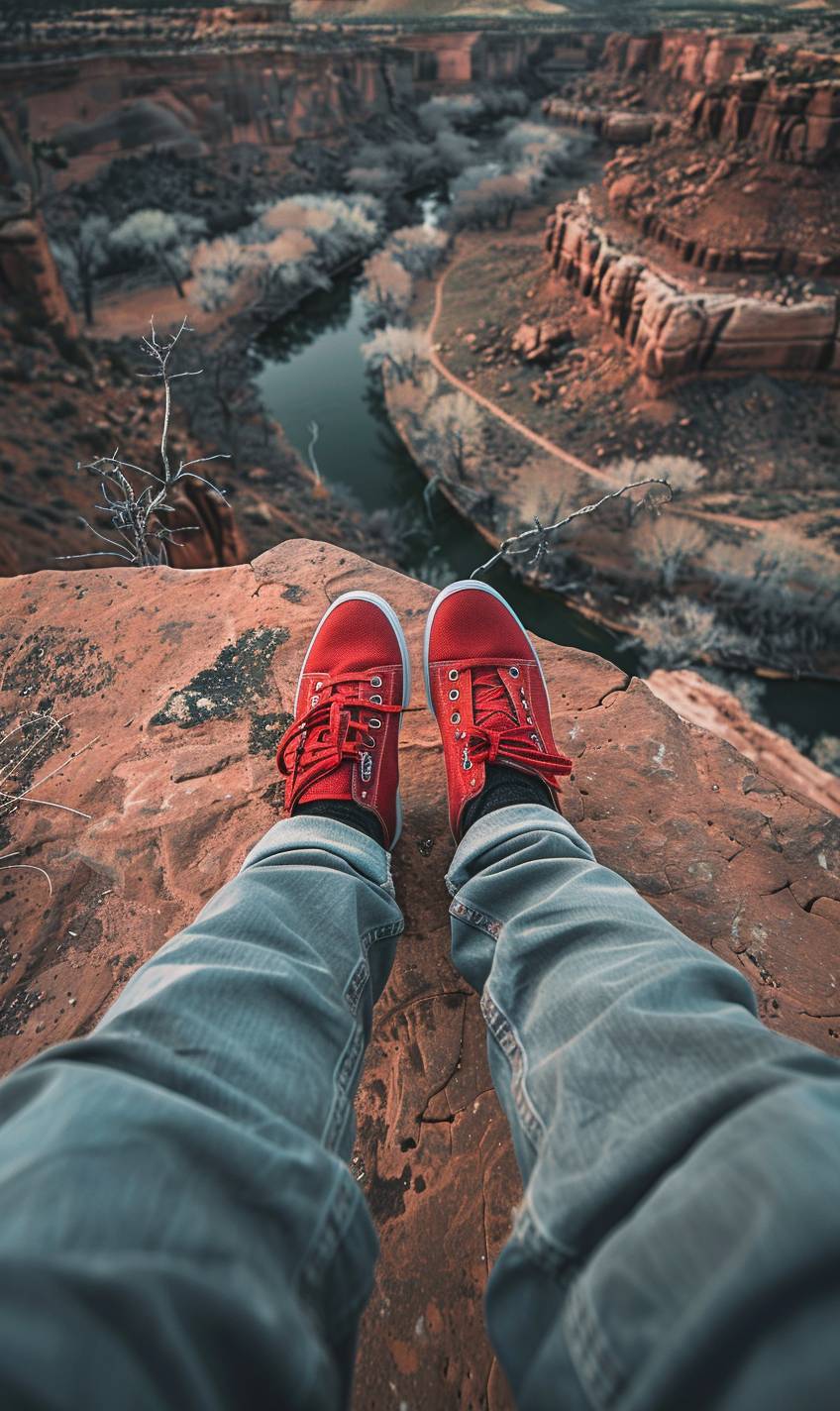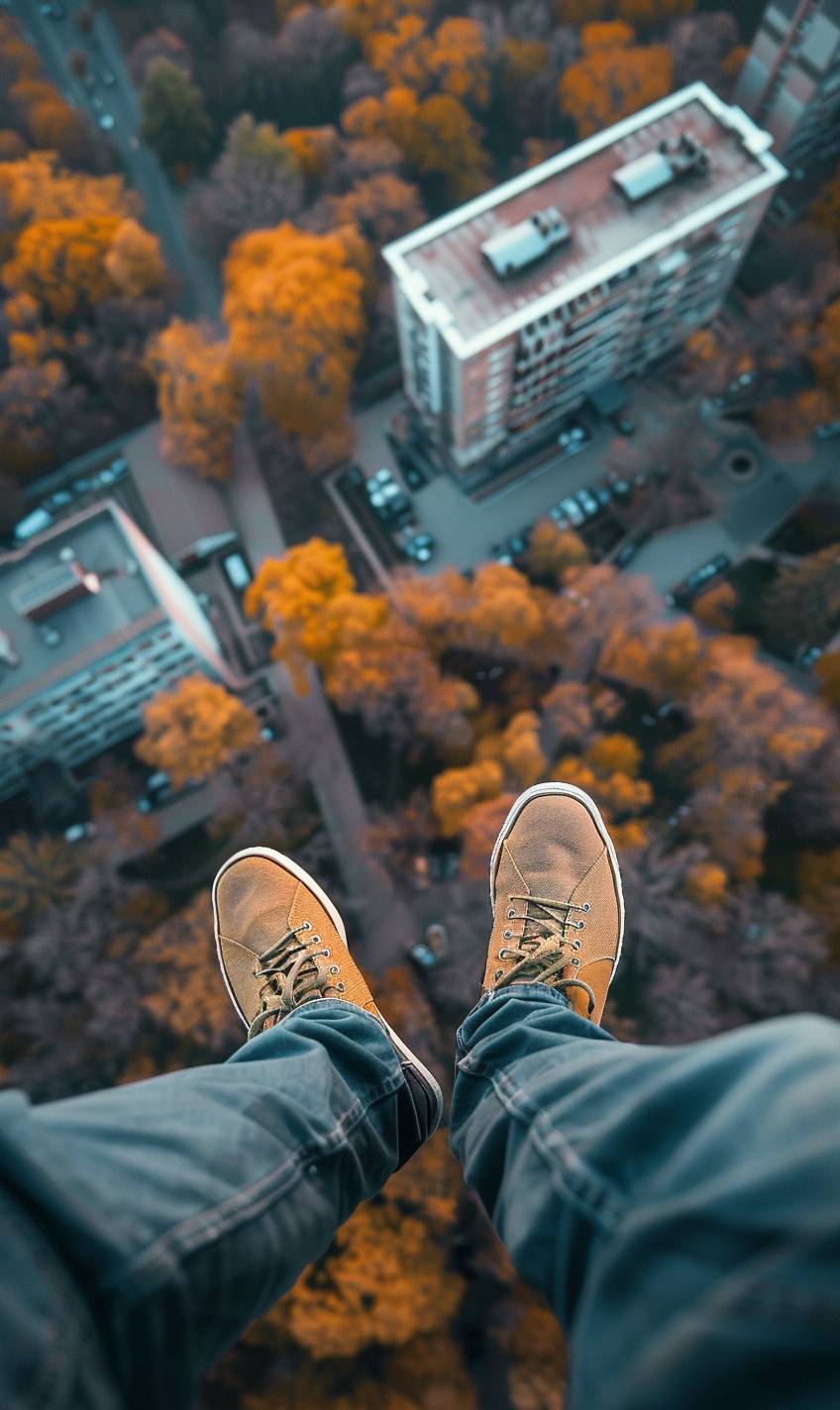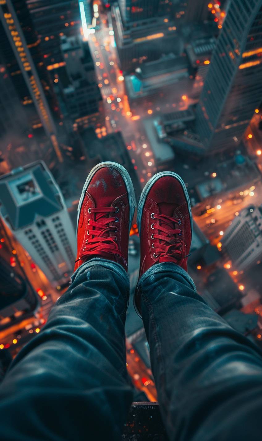 POV of man wearing [color shoes] on top [place], overlooking [environment description], shot with Sony Alpha A7 III, wide-angle. hyper realistic, cinematic photography, top view --ar 3:5 --v 6.0