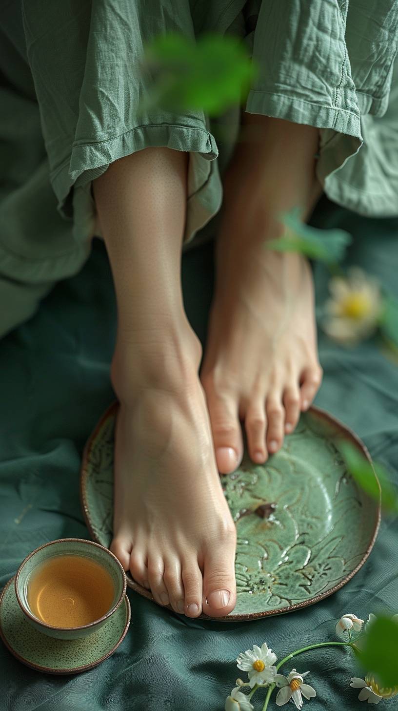 Photo of an Japanese woman's feet, Focus on the feet, foot close-up,Fair skin, five toes clearly visible, skin tender and smooth, photography, high detail, realistic, natural skin texture, foot model, jade foot, Chinese, Korean, Best Skin Detail, Below the knee area, There is tea next to her feet, 8K --ar 9:16 --style raw --stylize 500 --v 6.0