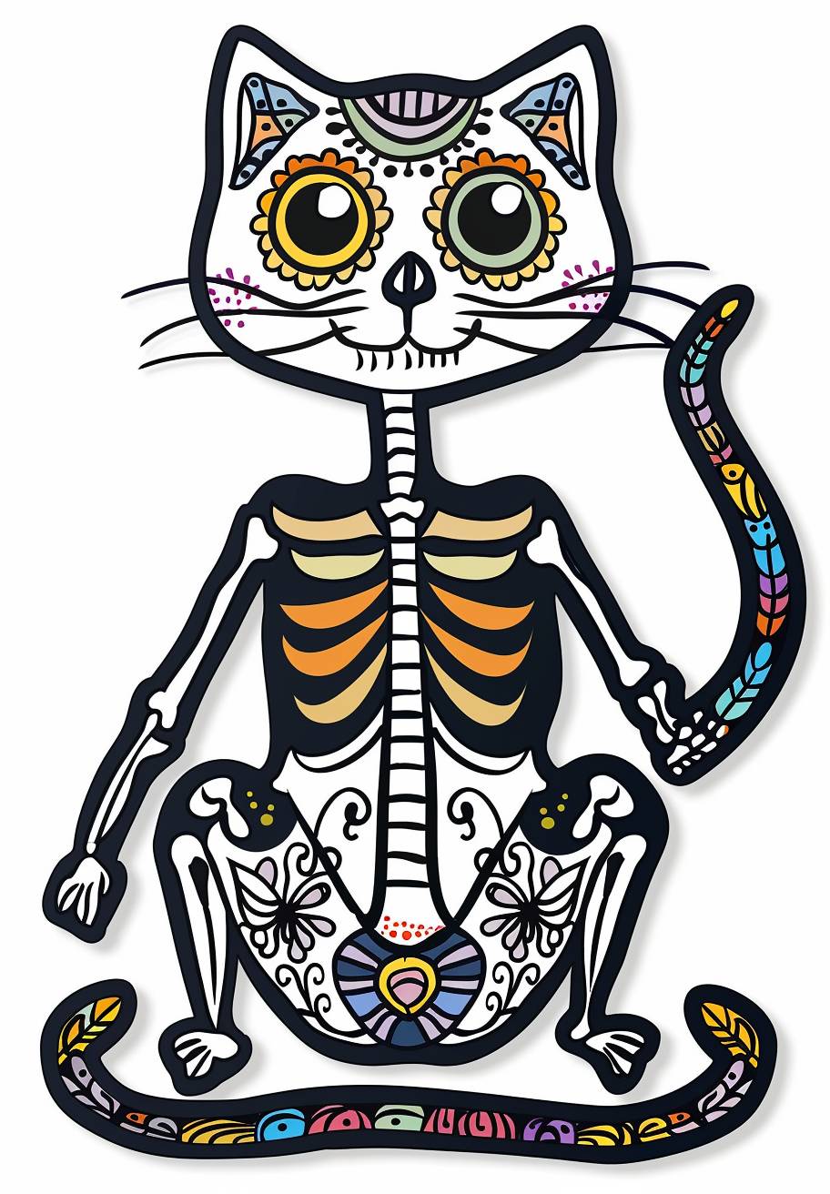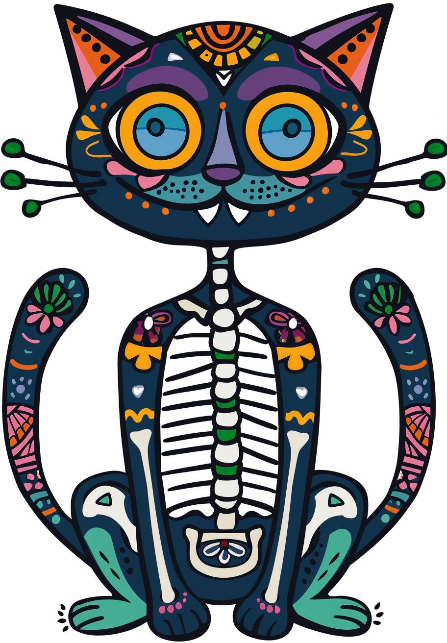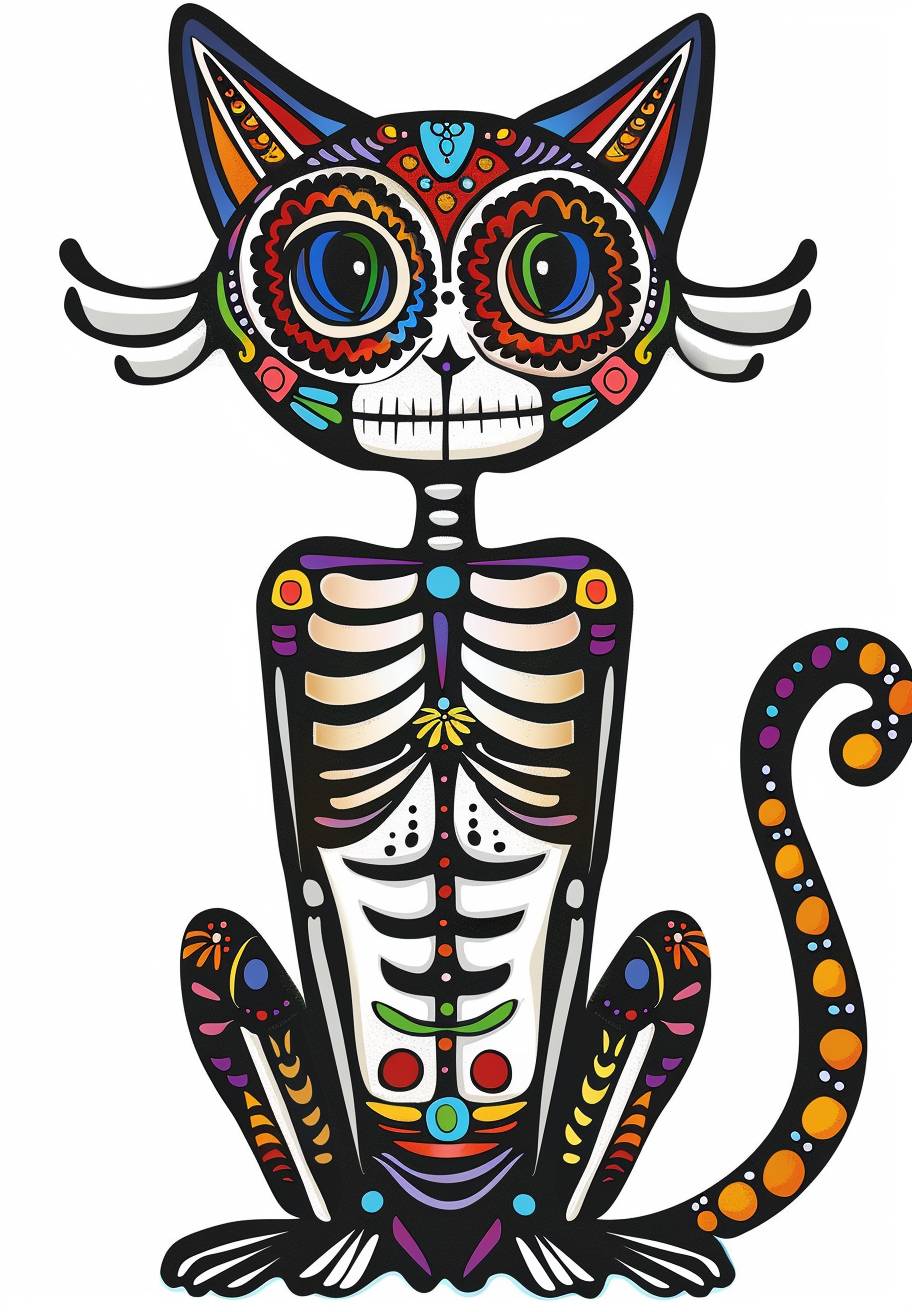 Mexican cat skeleton, clipart style with black outline and white background, colorful face with big eyes, cute and happy expression, in the center of his body is decorated as if for the Day of the Dead. --ar 89:128 --v 6.0