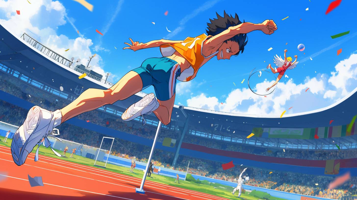 Olympic Event Scene showcasing a high jump competition, featuring Luffy, set in an Olympic stadium, capturing the excitement and intensity of competition, style focusing on dynamic poses, vibrant action, and detailed character designs, --ar 16:9 --niji 6