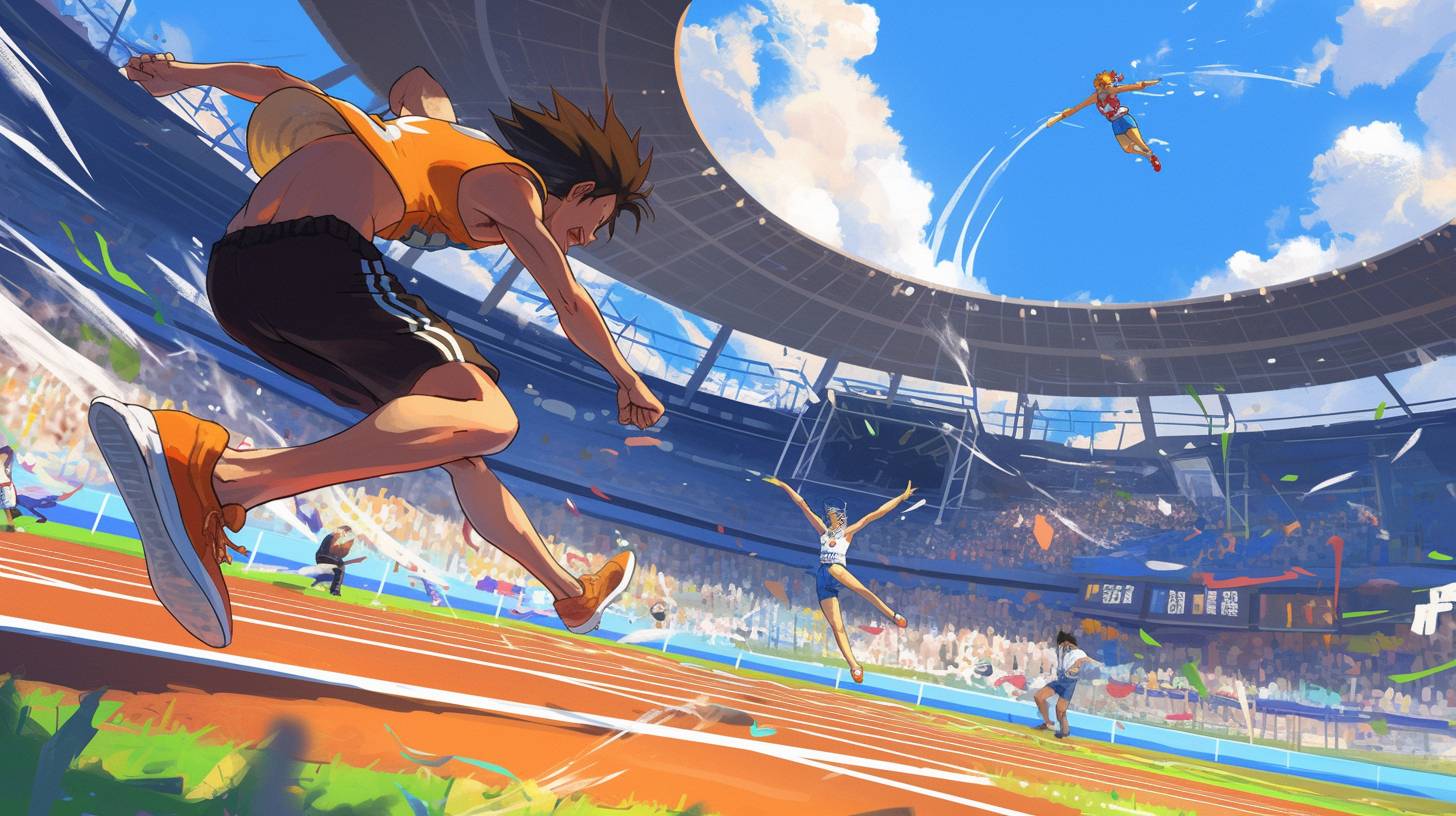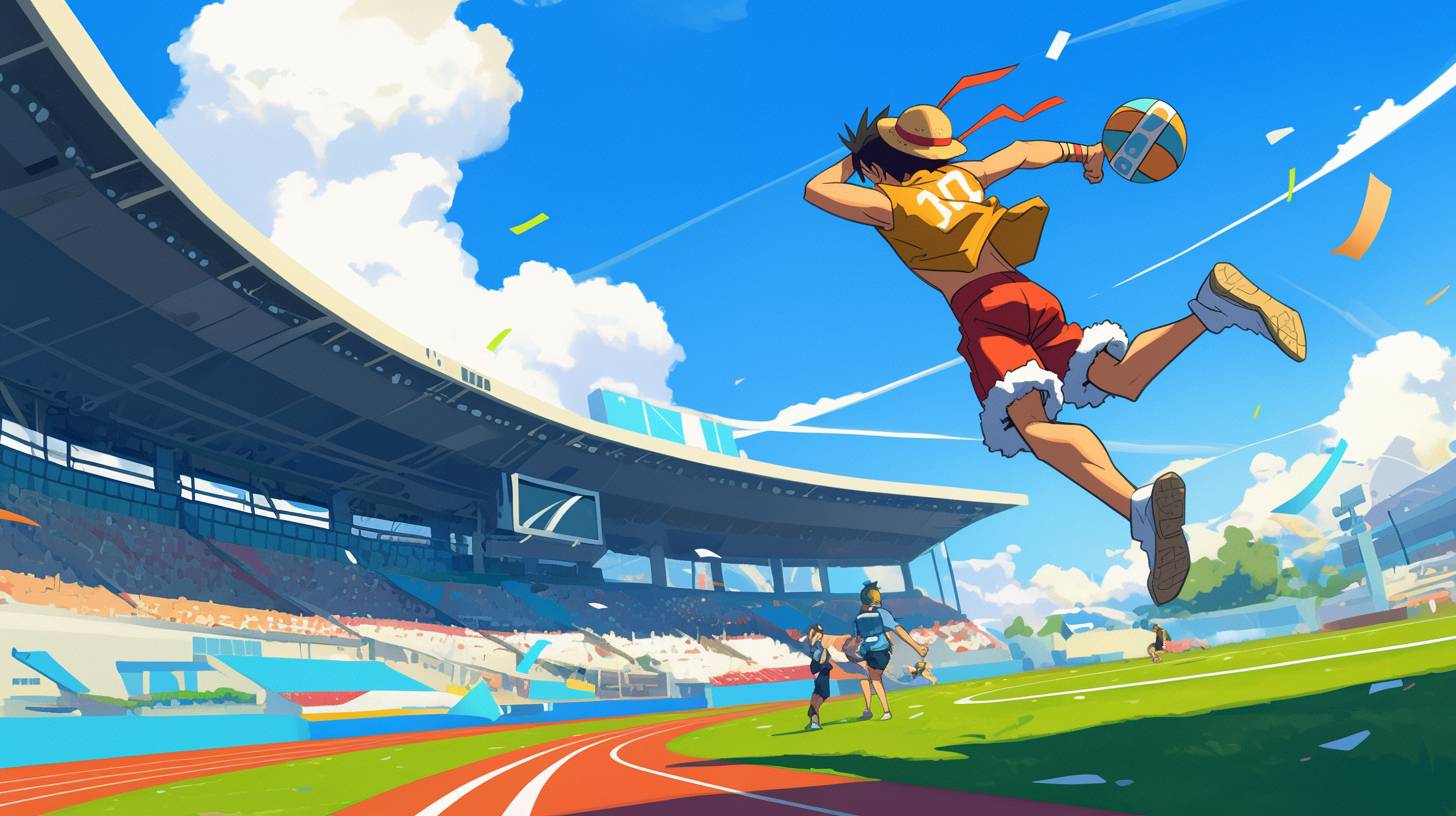 Olympic Event Scene showcasing a high jump competition featuring Luffy, set in an Olympic stadium, capturing the excitement and intensity of competition, with a style focusing on dynamic poses, vibrant action, and detailed character designs.