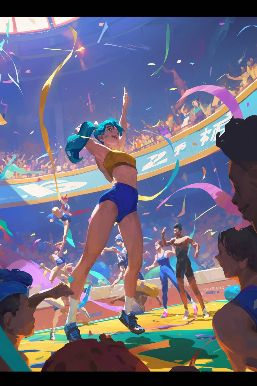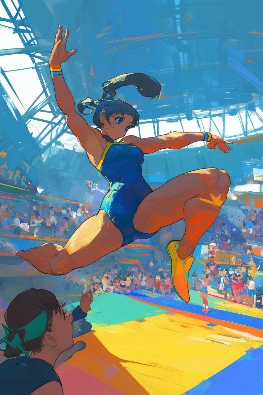 Olympic Event Scene Gymnastics, featuring bulma, set in gymnasium, capturing the excitement and intensity of competition, style focusing on dynamic poses, vibrant action, and detailed character designs, --ar 2:3 --niji 6