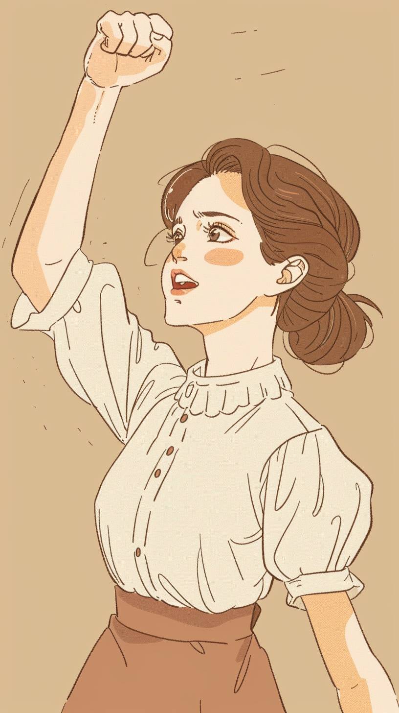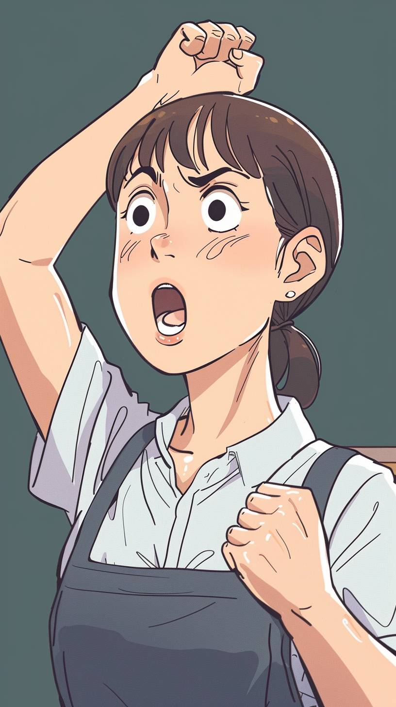 A housewife in her 30s. Her brows are furrowed and her mouth is wide open. She is posing with her right hand raised, looking motivated. An illustration in a doodle style, as if drawn by a child. ghibli-style. --ar 9:16 --style raw --v 6.0