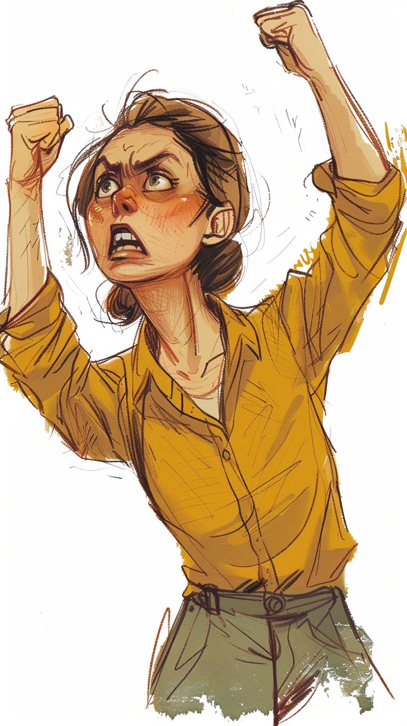 A housewife in her 30s. Her brows are furrowed and her mouth is wide open. She is posing with her right hand raised, looking motivated. An illustration in a doodle style, as if drawn by a child, in a Ghibli style.