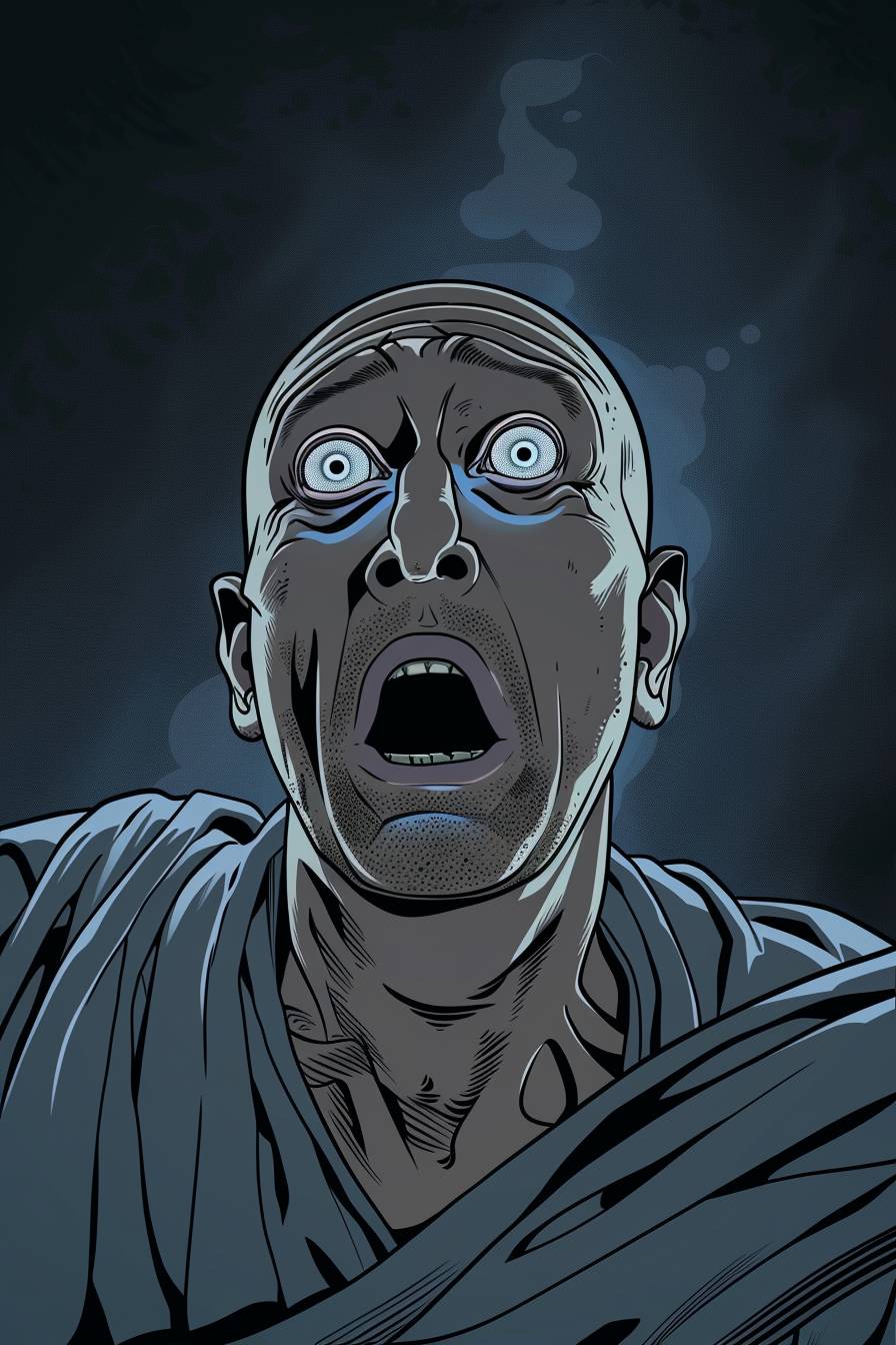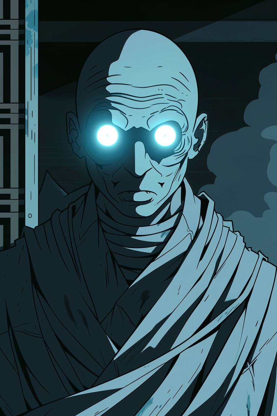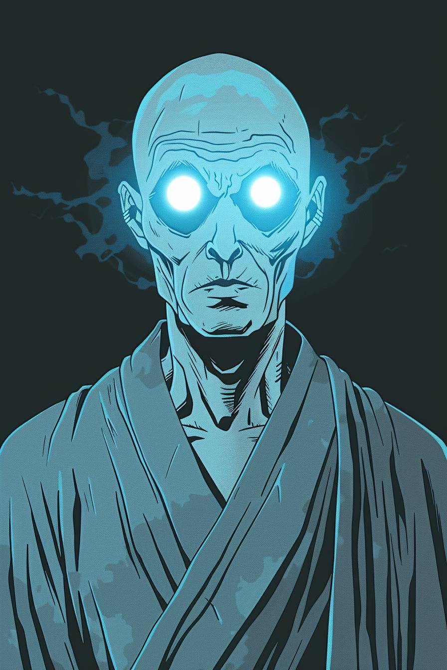 a bald mummy with glowing blue eyes wearing gray robe. simple flat illustration. In the style of comic book. flat colors. shocked expression. Dramatic lighting --ar 2:3 --v 6.0