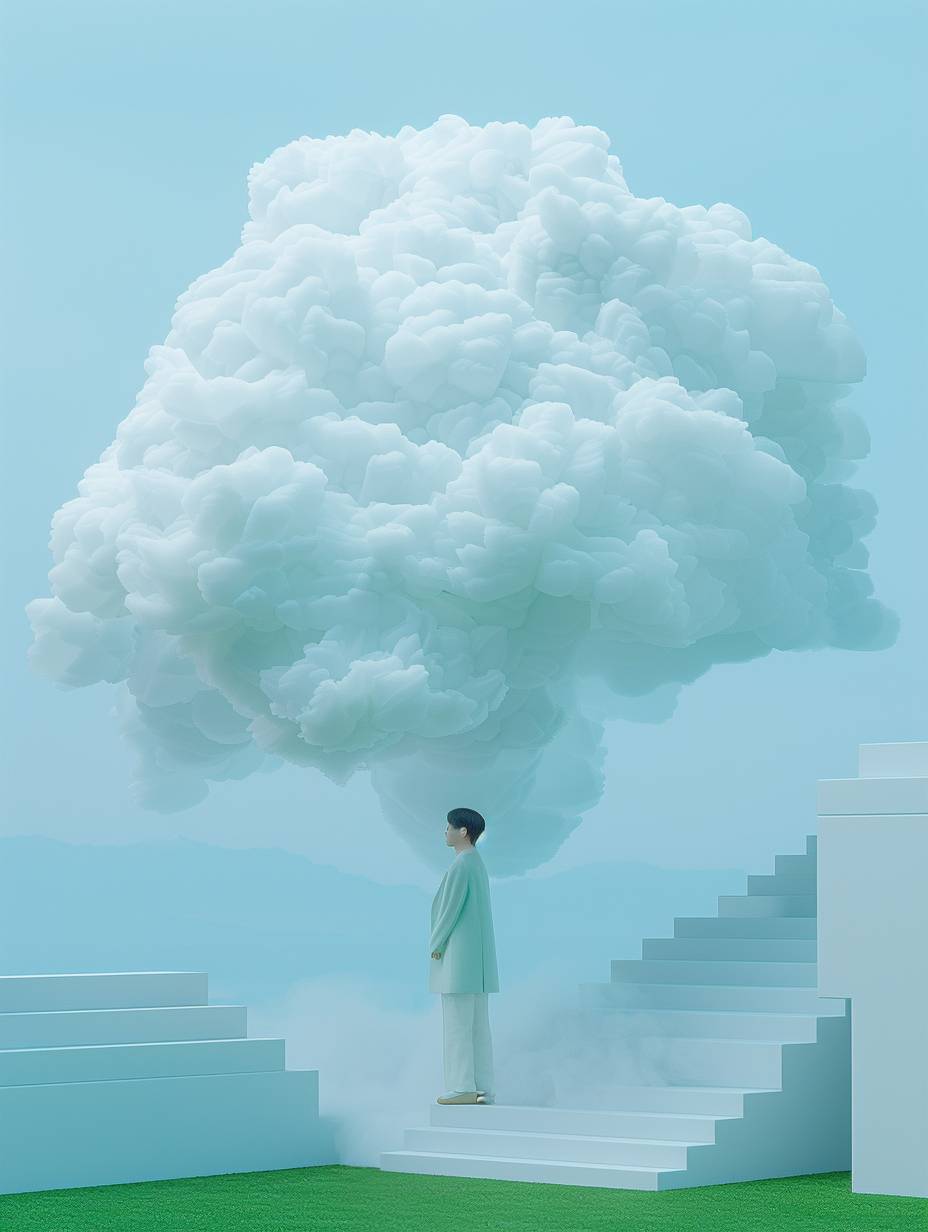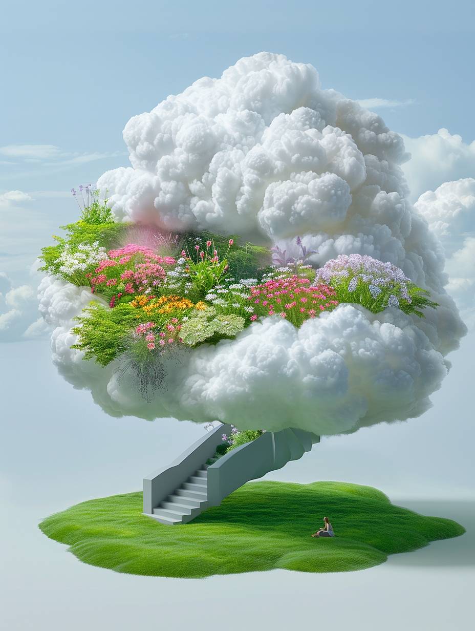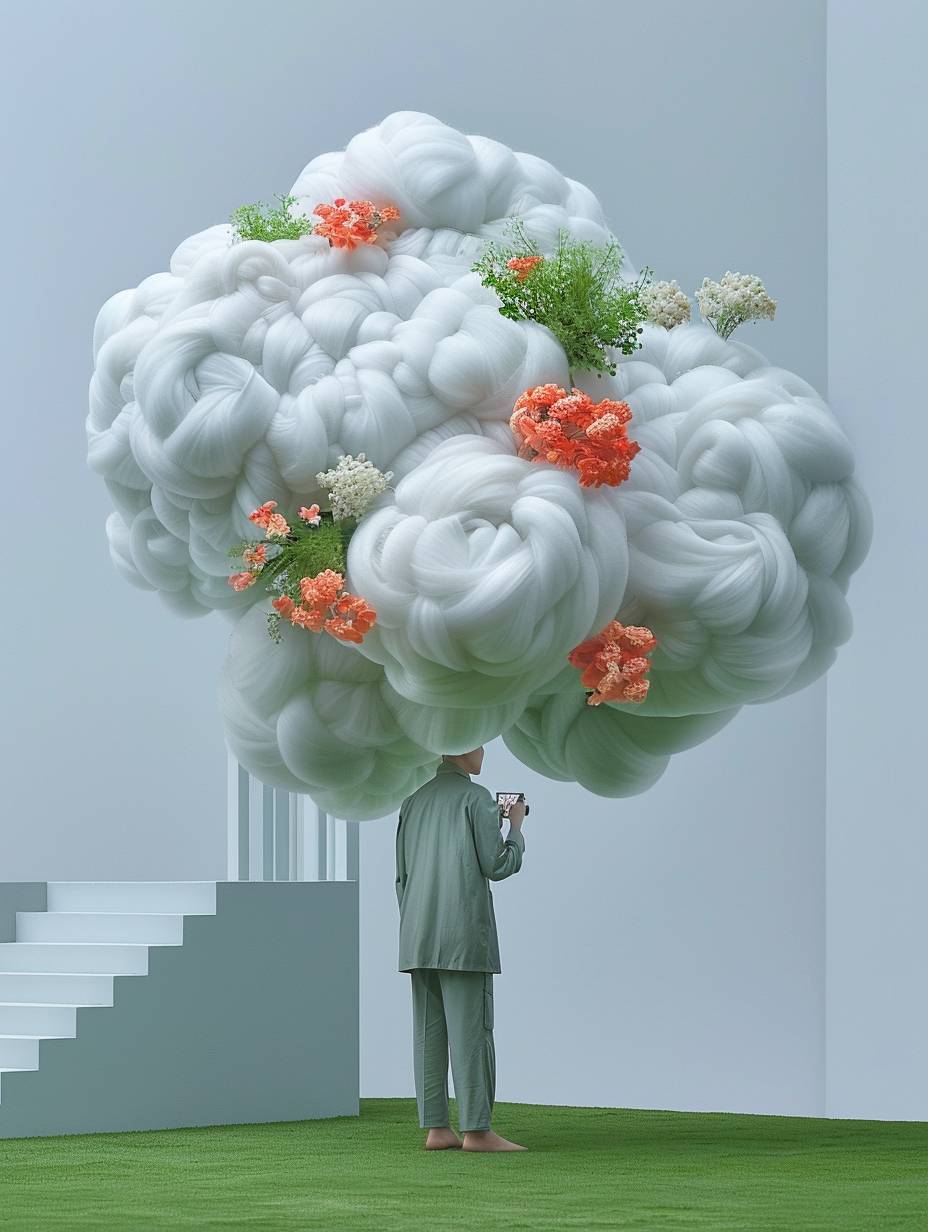 In the center of an outdoor lawn, there is a huge white cloud installation with flowers and plants inside it. The green grass surface has various flower arrangements on top, creating high-definition photography style images. There was also one person taking photos next to them, surrounded by gray stairs. This scene gives people both warmth from nature and futuristic feeling.,,in --chaos 6 --ar 3:4 --personalize zww2nvy --stylize 750 --v 6.0