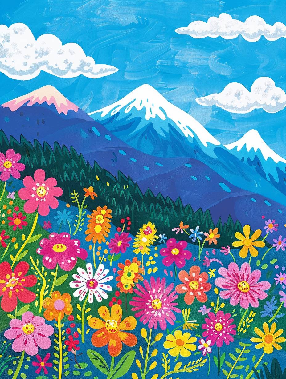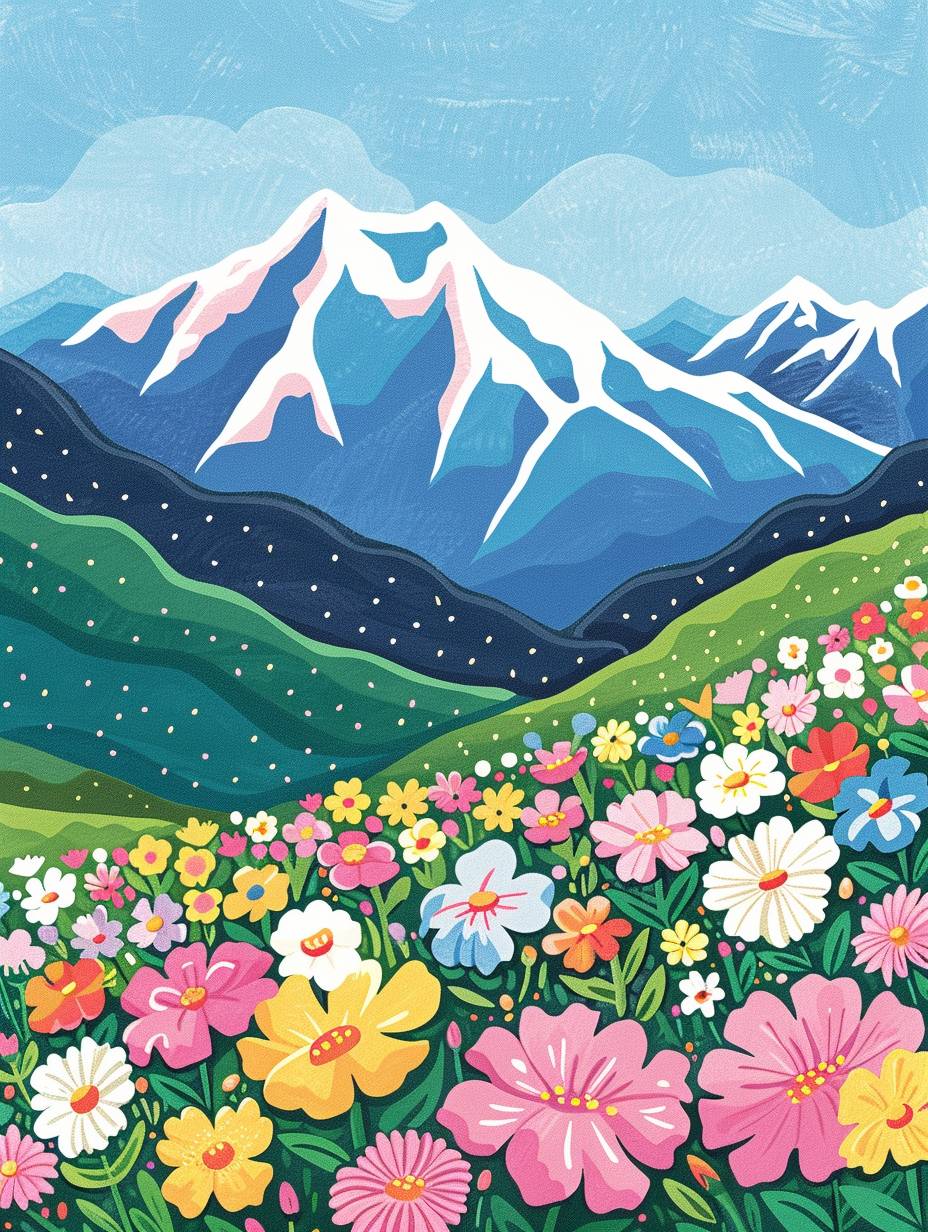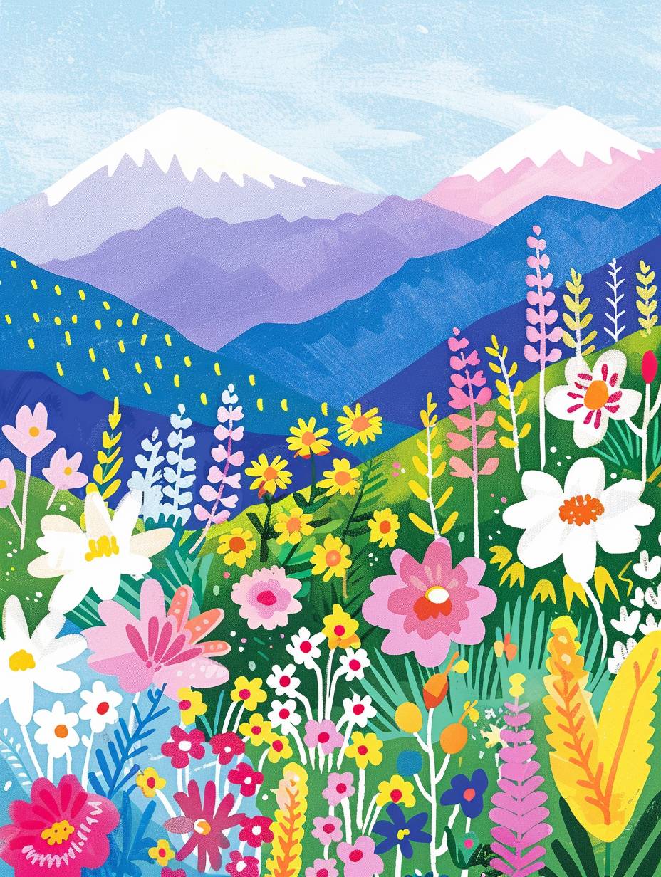 minimalism, the minimalist style, mountains full of flowers,Henry Matisse’s colors, Henry Matisse’s lithograph, Isometric Anime style,simple quirky water color inspired illustrations,The New Yorker magazine Cover, modern --no people and face no words --ar 3:4 --personalize 33wgj8j --stylize 150 --v 6.0