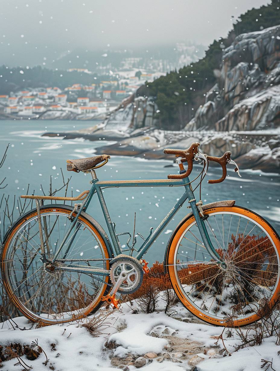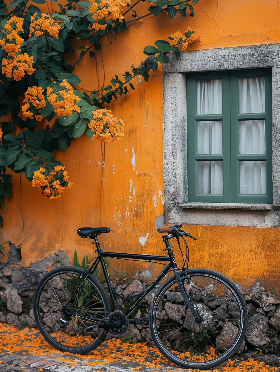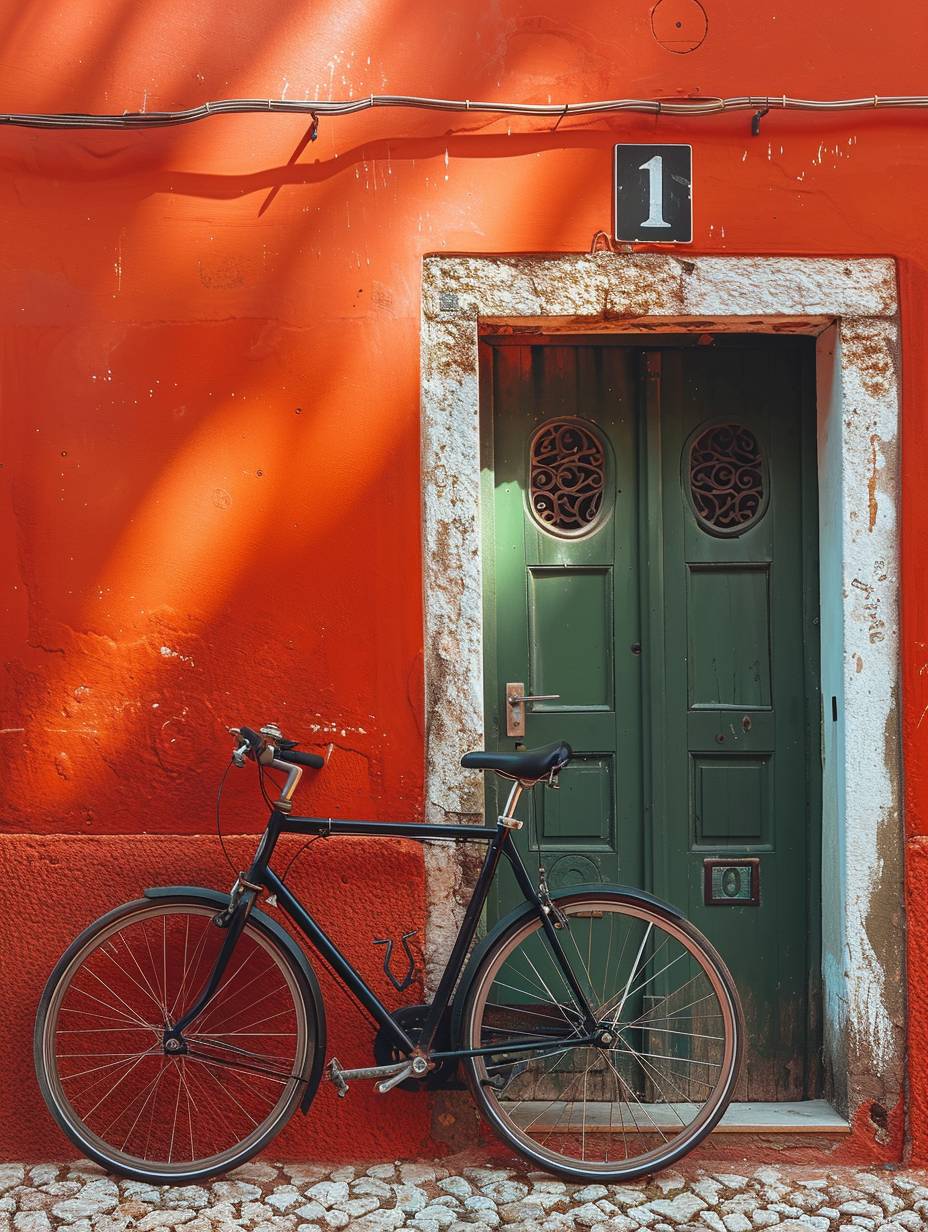 A sleek, vintage bike leaning against an orange wall with green trim, creating a striking contrast that highlights the simplicity and elegance of minimalism in urban cycling. The bike's black frame contrasts beautifully against the vibrant background, symbolizing style over form. The focus is on the bike's frame. --ar 3:4 --stylize 750 --v 6.0